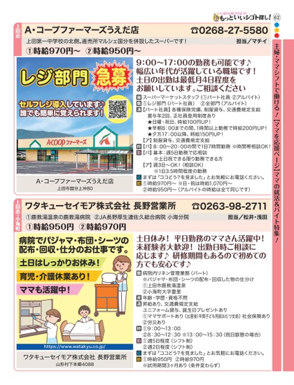 ●●●62主婦・ママシフトで働ける!【ママを応援ページ】ママの就活&バイト特集!☎0268-27-5580担当/マチイA・コープファーマーズうえだ店上田第一中学校の北側。直売所マルシェ国分を併設したスーパーです!①時給970円〜②時給950円〜上田市レジ部門急募9:00〜17:00の勤務も可能です♪幅広い年代が活躍している職場です!土日の出勤は最低月4日程度をお願いしています。ご相談くださいセルフレジ導入しています♪誰でも簡単に覚えられます!A・コープファーマーズうえだ店上田市国分上沖80スーパーマーケットスタッフ(①パート社員②アルバイト)①レジ部門(パート社員)②全部門(アルバイト)【パート社員】各種保険完備、制服貸与、交通費規定支給賞与年2回、正社員登用制度あり★日曜・祝日、時給100円UP!★早朝8:00までの間、1時間以上勤務で時給200円UP!★夕方17:00以降、時給150円UP!【ア】制服貸与、交通費規定支給【パ】8:00〜20:00の間で1日7時間勤務※時間帯相談OK!【パ】基本:週5日勤務で応相談※土日祝できる限り勤務できる方【ア】週3日〜OK!(相談OK)※1日3.5時間程度の勤務まずは「ココどう?を見ました」とお気軽にお電話ください。①時給970円〜※日・祝は時給1,070円〜②時給950円〜(アルバイトの時給は全て同じです)ワタキューセイモア株式会社長野営業所①鹿教湯温泉の鹿教湯病院②JA長野厚生連佐久総合病院小海分院①時給950円②時給970円病院でパジャマ・布団・シーツの配布・回収・仕分のお仕事です。土日はしっかりお休み!育児・介護休業あり!ママも活躍中!上田市・小海町☎0263-98-2711担当/松井・浅田土日休み!平日勤務のママさん活躍中!未経験者大歓迎!出勤日時ご相談に応じます♪研修期間もあるので初めての方でも安心です♪病院内リネン管理業務(パート)※パジャマ・布団・シーツの配布・回収した物の仕分け①上田市鹿教湯温泉②小海町大字豊里年齢・学歴・資格不問昇給あり、交通費規定支給ユニフォーム貸与、誕生日プレゼントあり①ママサポートあり(出産後1年間子ども用紙おむつ支給)社会保険あり②労災あり①9:00〜13:00②8:30〜12:30※13:00〜15:30(祝日振替の場合)①週5日程度(シフト制)②週2日程度(シフト制)まずは「ココどう?を見ました」とお気軽にお電話ください。①時給950円②時給970円※試用期間3ヶ月あり(条件変わらず)https://www.watakyu.co.jp/ワタキューセイモア株式会社長野営業所山形村下本郷4088