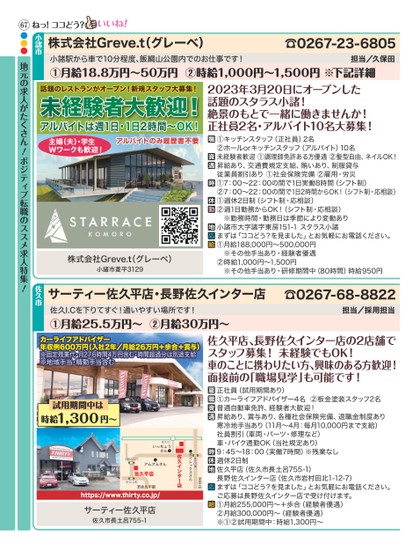 ☎0267-23-6805株式会社Greve.t(グレーベ)小諸市●●●67ねっ!ココどう?小諸駅から車で10分程度、飯綱山公園内でのお仕事です!①月給18.8万円〜50万円②時給1,000円〜1,500円※下記詳細担当/久保田話題のレストランがオープン!新規スタッフ大募集!未経験者大歓迎!アルバイトは週1日・1日2時間〜OK!アルバイトのみ履歴書不要主婦(夫)・学生Wワークも歓迎!株式会社Greve.t(グレーベ)小諸市菱平31292023年3月20日にオープンした話題のスタラス小諸!絶景のもとで一緒に働きませんか!正社員2名・アルバイト10名大募集!①キッチンスタッフ(正社員)2名②ホールorキッチンスタッフ(アルバイト)10名未経験者歓迎①調理師免許ある方優遇②髪型自由、ネイルOK!昇給あり、交通費規定支給、賄いあり、制服貸与従業員割引あり①社会保険完備②雇用・労災①7:00〜22:00の間で1日実働8時間(シフト制)②7:00〜22:00の間で1日2時間からOK!(シフト制・応相談)①週休2日制(シフト制・応相談)②週1日勤務からOK!(シフト制・応相談)※勤務時間・勤務日は季節により変動あり小諸市大字諸字東房151-1スタラス小諸まずは「ココどう?を見ました」とお気軽にお電話ください。①月給188,000円〜500,000円※その他手当あり・経験者優遇②時給1,000円〜1,500円※その他手当あり・研修期間中(80時間)時給950円地元の求人がたくさん!ポジティブ転職のススメ求人特集佐久平店、長野佐久インター店の2店舗でスタッフ募集!未経験でもOK!車のことに携わりたい方、興味のある方歓迎!面接前の「職場見学」も可能です!正社員(試用期間あり)①カーライフアドバイザー4名②板金塗装スタッフ2名普通自動車免許、経験者大歓迎!昇給あり、賞与あり、各種社会保険完備、退職金制度あり寒冷地手当あり(11月〜4月:毎月10,000円まで支給)社員割引(車両・パーツ・修理など)車・バイク通勤OK(当社規定あり)9:45〜18:00(実働7時間)※残業なし週休2日制佐久平店(佐久市長土呂755-1)長野佐久インター店(佐久市岩村田北1-12-7)まずは「ココどう?を見ました」とお気軽にお電話ください。ご応募は長野佐久インター店で受け付けます。①月給255,000円〜+歩合(経験者優遇)②月給300,000円〜(経験者優遇)※①②試用期間中:時給1,300円〜カーライフアドバイザー年収例600万円(入社2年/月給26万円+歩合+賞与)※固定残業代・月27.6時間4万円含む・時間超過分は別途支給※地域手当・精勤手当含む試用期間中は時給円〜1,300佐久インター店佐久平店https://www.thirty.co.jp/サーティー佐久平店佐久市長土呂755-1☎0267-68-8822担当/採用担当サーティー佐久平店・長野佐久インター店佐久I.Cを下りてすぐ!通いやすい場所です!①月給25.5万円〜②月給30万円〜佐久市!