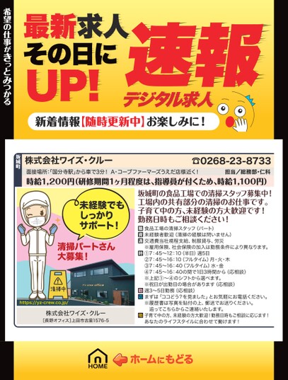 最新求人その日にUP!デジタル求人速報新着情報【随時更新中】お楽しみに!希望の仕事がきっとみつかる希望の仕事がきっとみつかる坂城町株式会社ワイズ・クルー☎0268-23-8733担当/総務部・仁科面接場所:「国分寺駅」から車で3分!A・コープファーマーズうえだ店様近く!時給1,200円(研修期間1ヶ月程度は、指導員が付くため、時給1,100円)坂城町の食品工場での清掃スタッフ募集中!工場内の共有部分の清掃のお仕事です。子育て中の方、未経験の方大歓迎です!勤務日時もご相談ください!未経験でもしっかりサポート!清掃パートさん大募集!https://yz-crew.co.jp/株式会社ワイズ・クルー[長野オフィス]上田市古里1576-5食品工場の清掃スタッフ(パート)未経験者歓迎(清掃の経験は問いません)交通費当社規程支給、制服貸与、労災※雇用保険、社会保険の加入は勤務条件により異なります。①7:45〜12:10(半日)週5日②7:45〜16:10(フルタイム)月・火・木③7:45〜16:40(フルタイム)水・金④7:45〜16:40の間で1日3時間から(応相談)※上記①〜④のシフトから選べます。※祝日が出勤日の場合があります(応相談)週3〜5日勤務(応相談)まずは「ココどう?を見ました」とお気軽にお電話ください。※履歴書は写真を貼付の上、郵送でお送りください。追ってこちらからご連絡いたします。子育て中の方、未経験の方大歓迎!勤務日時もご相談に応じます!あなたのライフスタイルに合わせて働けます!