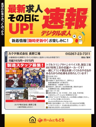 最新求人その日にUP!デジタル求人速報新着情報【随時更新中】お楽しみに!希望の仕事がきっとみつかる希望の仕事がきっとみつかる☎0267-23-7311担当/堂本カクタ株式会社長野工場小諸高校から浅間サンラインに向かい、松井トンネルの手前です!月給19万円〜22万円小諸市製造スタッフ募集!やる気があって、長期的に勤務できる方お待ちしています!トグルクランプやハンドバイス等、製造工場向け特殊工具の老舗メーカーです!一緒にブランド製品を創ってくれるやる気のある方からの応募をお待ちしています!正社員(2名)工具の製造・組立44歳まで(省令3号のイ)、高卒以上普通自動車免許(AT限定可)経験者歓迎!未経験でもOK!昇給あり、賞与あり、社会保険完備、家族手当あり交通費規定支給、退職金制度あり8:00〜17:00週休2日制(土・日・その他)、GW、お盆、年末年始※会社カレンダーによる(年間休日121日)まずは「ココどう?を見ました」とお気軽にお電話ください。メールでもご応募いただけます。doumoto@kakuta-clamp.com特殊工具の老舗メーカーです。ぜひ当社のHPを閲覧してみてください!やる気のある方お待ちしています!月給190,000円〜220,000円https://www.kakuta-clamp.com/カクタ株式会社長野工場小諸市甲御堂上4533-1