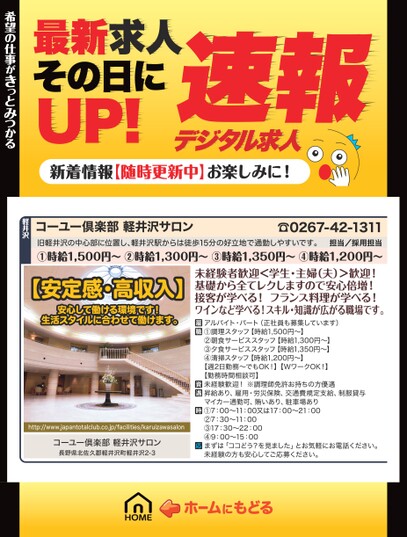 最新求人その日にUP!デジタル求人速報新着情報【随時更新中】お楽しみに!コーユー倶楽部軽井沢サロン☎0267-42-1311希望の仕事がきっとみつかる希望の仕事がきっとみつかる軽井沢担当/採用担当旧軽井沢の中心部に位置し、軽井沢駅からは徒歩15分の好立地で通勤しやすいです。①時給1,500円〜②時給1,300円〜③時給1,350円〜④時給1,200円〜未経験者歓迎<学生・主婦(夫)>歓迎!基礎から全てレクしますので安心倍増!接客が学べる!フランス料理が学べる!ワインなど学べる!スキル・知識が広がる職場です。【安定感・高収入】安心して働ける環境です!生活スタイルに合わせて働けます。アルバイト・パート(正社員も募集しています)①調理スタッフ【時給1,500円〜】②朝食サービススタッフ【時給1,300円〜】③夕食サービススタッフ【時給1,350円〜】④清掃スタッフ【時給1,200円〜】週2日勤務〜でもOK!】【WワークOK!】勤務時間相談可】未経験歓迎!※調理師免許お持ちの方優遇昇給あり、雇用・労災保険、交通費規定支給、制服貸与マイカー通勤可、賄いあり、駐車場あり①7:00〜11:00又は17:00〜21:00②7:30〜11:00③17:30〜22:00④9:00〜15:00まずは「ココどう?を見ました」とお気軽にお電話ください。未経験の方も安心してご応募ください。http://www.japantotalclub.co.jp/facilities/karuizawasalonコーユー倶楽部軽井沢サロン長野県北佐久郡軽井沢町軽井沢2-3
