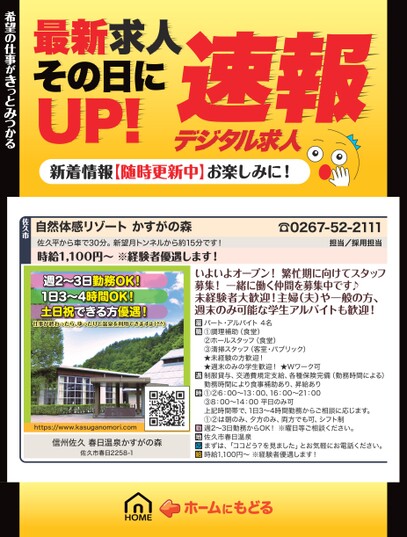 最新求人その日にUP!デジタル求人速報新着情報【随時更新中】お楽しみに!希望の仕事がきっとみつかる希望の仕事がきっとみつかる週2〜3日勤務OK!1日3〜4時間OK!土日祝できる方優遇!仕事が終わったら、ゆったりと温泉を利用できますよ(^^)https://www.kasuganomori.com信州佐久春日温泉かすがの森佐久市春日2258-1いよいよオープン!繁忙期に向けてスタッフ募集!一緒に働く仲間を募集中です♪未経験者大歓迎!主婦(夫)や一般の方、週末のみ可能な学生アルバイトも歓迎!パート・アルバイト4名①調理補助(食堂)②ホールスタッフ(食堂)③清掃スタッフ(客室・パブリック)★未経験の方歓迎!★週末のみの学生歓迎!★Wワーク可制服貸与、交通費規定支給、各種保険完備(勤務時間による)勤務時間により食事補助あり、昇給あり①②6:00〜13:00、16:00〜21:00③8:00〜14:00平日のみ可上記時間帯で、1日3〜4時間勤務からご相談に応じます。①②は朝のみ、夕方のみ、両方でも可、シフト制週2〜3日勤務からOK!※曜日等ご相談ください。佐久市春日温泉まずは、「ココどう?を見ました」とお気軽にお電話ください。時給1,100円〜※経験者優遇します!☎0267-52-2111担当/採用担当自然体感リゾートかすがの森佐久平から車で30分。新望月トンネルから約15分です!時給1,100円〜※経験者優遇します!佐久市