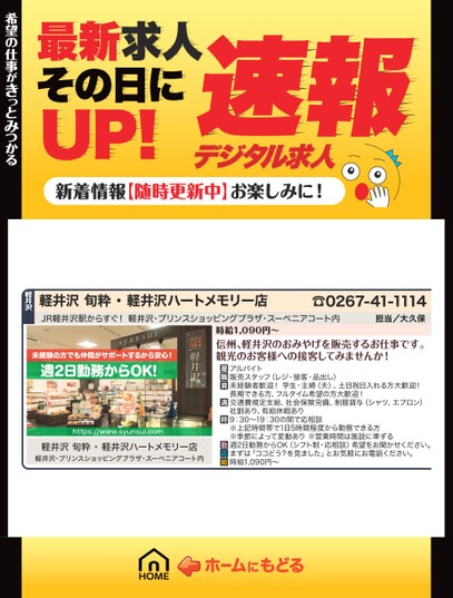 最新求人その日にUP!デジタル求人速報新着情報【随時更新中】お楽しみに!軽井沢旬粋・軽井沢ハートメモリー店JR軽井沢駅からすぐ!軽井沢・プリンスショッピングプラザ・スーベニアコート内☎0267-41-1114担当/大久保未経験の方でも仲間がサポートするから安心!週2日勤務からOK!https://www.syunsui.com軽井沢旬粋・軽井沢ハートメモリー店軽井沢・プリンスショッピングプラザ・スーベニアコート内時給1,090円〜信州、軽井沢のおみやげを販売するお仕事です。観光のお客様への接客してみませんか!アルバイト販売スタッフ(レジ・接客・品出し)未経験者歓迎!学生・主婦(夫)、土日祝日入れる方大歓迎!長期できる方、フルタイム希望の方大歓迎!交通費規定支給、社会保険完備、制服貸与(シャツ、エプロン)社割あり、有給休暇あり9:30〜19:30の間で応相談※上記時間帯で1日5時間程度から勤務できる方※季節によって変動あり※営業時間は施設に準ずる週2日勤務からOK(シフト制・応相談)希望をお聞かせください。まずは「ココどう?を見ました」とお気軽にお電話ください。時給1,090円〜希望の仕事がきっとみつかる希望の仕事がきっとみつかる軽井沢