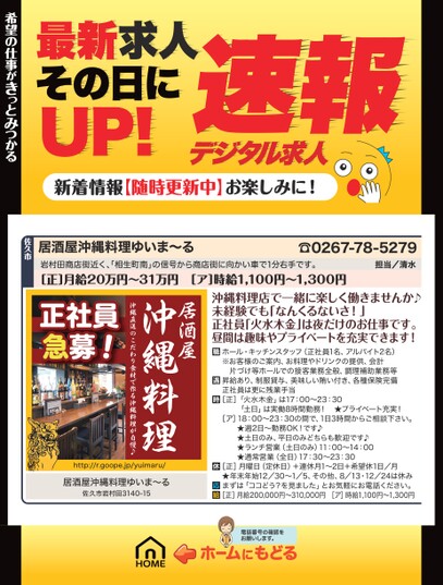最新求人その日にUP!デジタル求人速報新着情報【随時更新中】お楽しみに![正]月給20万円〜31万円[ア]時給1,100円〜1,300円☎0267-78-5279希望の仕事がきっとみつかる希望の仕事がきっとみつかる佐久市沖縄料理店で一緒に楽しく働きませんか♪未経験でも「なんくるないさ!」正社員「火水木金」は夜だけのお仕事です。昼間は趣味やプライベートを充実できます!ホール・キッチンスタッフ(正社員1名、アルバイト2名)※お客様のご案内、お料理やドリンクの提供、会計片づけ等ホールでの接客業務全般、調理補助業務等昇給あり、制服貸与、美味しい賄い付き、各種保険完備正社員は更に残業手当[正]「火水木金」は17:00〜23:30「土日」は実働8時間勤務!★プライベート充実![ア]18:00〜23:30の間で、1日3時間からご相談下さい。★週2日〜勤務OK!です♪★土日のみ、平日のみどちらも歓迎です♪★ランチ営業(土日のみ)11:00〜14:00★通常営業(全日)17:30〜23:30[正]月曜日(定休日)+連休月1〜2日+希望休1日/月★年末年始12/30〜1/5、その他、8/13・12/24は休みまずは「ココどう?を見ました」とお気軽にお電話ください。[正]月給200,000円〜310,000円[ア]時給1,100円〜1,300円電話番号の確認をお願いします。居酒屋沖縄料理沖縄直送のこだわり食材で作る沖縄料理が自慢♪正社員急募!
