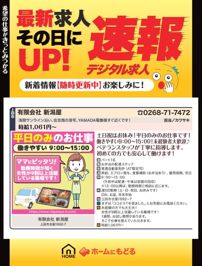 最新求人その日にUP!デジタル求人速報新着情報【随時更新中】お楽しみに!希望の仕事がきっとみつかる希望の仕事がきっとみつかる☎0268-71-7472担当/カワサキ有限会社新潟屋浅間サンライン沿い、住吉南の信号、YAMADA電機様すぐ近くです!時給1,061円〜上田市平日のみのお仕事働きやすい9:00~15:00ママにピッタリ!勤務時間が短く女性が9割以上活躍している職場です!https://www.niigataya-b.com/有限会社新潟屋上田市古里1992-7土日祝はお休み!平日のみのお仕事です!働きやすい9:00〜15:00!未経験者大歓迎♪ベテランスタッフが丁寧に指導します。初めての方でも安心して働けます!パート1名お弁当の配達スタッフ普通自動車免許(AT限定可)昇給、エプロン貸与、食事補助(お弁当あり)、雇用保険、労災9:00〜15:00(午前中は配達・午後は容器の回収)※13:00以降は、勤務時間ご相談に応じます。週5日勤務(土・日・祝日、お休みです)GW、お盆、年末年始上田市古里1992ー7まずは「ココどう?を見ました」とお気軽にお電話ください。未経験の方でも大丈夫!女性が9割以上活躍している職場です!1週間、お試し期間があります。そこで仕事を覚えていただきます。時給1,061円〜