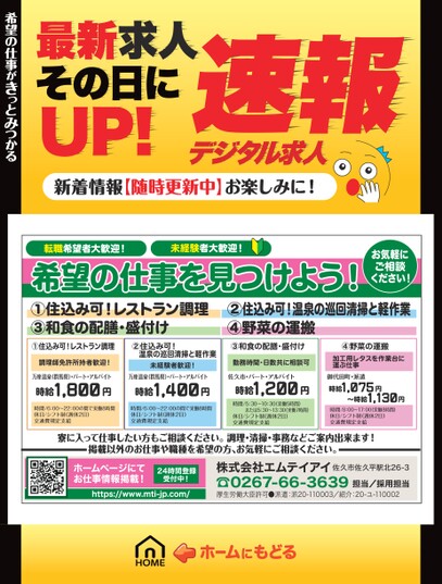 最新求人その日にUP!デジタル求人速報新着情報【随時更新中】お楽しみに!希望の仕事がきっとみつかる希望の仕事がきっとみつかる転職希望者大歓迎!未経験者大歓迎!希望の仕事を見つけよう!お気軽にご相談ください!①住込み可!レストラン調理③和食の配膳・盛付け②住込み可!温泉の巡回清掃と軽作業④野菜の運搬①住込み可!レストラン調理調理師免許所持者歓迎!②住込み可!温泉の巡回清掃と軽作業未経験者歓迎!③和食の配膳・盛付け勤務時間・日数共に相談可④野菜の運搬加工用レタスを作業台に運ぶ仕事万座温泉(群馬県)・パート・アルバイト時給1,800円万座温泉(群馬県)・パート・アルバイト時給1,400円時間/6:00〜22:00の間で実働8時間休日/シフト制(週休2日)交通費規定支給時間/6:00〜22:00の間で実働8時間休日/シフト制(週休2日)交通費規定支給佐久市・パート・アルバイト時給1,200円時間/5:30〜10:30(実働5時間)または5:30〜13:30(実働7時間)休日/シフト制(週休2日)交通費規定支給御代田町・派遣時給1,075円〜時給1,130円時間/8:00〜17:00(実働8時間)休日/シフト制(週休2日)交通費規定支給寮に入って仕事したい方もご相談ください。調理・清掃・事務などご案内出来ます!掲載以外のお仕事や職種を希望の方、お気軽にご相談ください。ホームページにてお仕事情報掲載!受付中!https://www.mti-jp.com/24時間登録株式会社エムテイアイ佐久市佐久平駅北26-3☎0267-66-3639厚生労働大臣許可●派遣:派20-110003/紹介:20-ユ-110002担当/採用担当