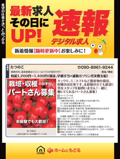 最新求人その日にUP!デジタル求人速報新着情報【随時更新中】お楽しみに!たつのこ☎090-8961-9244東御市内、湯楽里館近くビニールハウスが目印です!時給1,200円〜1,400円(別途、早朝手当+通勤ガソリン代実費支給)担当/柳谷希望の仕事がきっとみつかる希望の仕事がきっとみつかる東御市栽培・収穫のお手伝いパートさん募集未経験でも大歓迎!たつのこ上田市古里174-16中曽根アパートG号キュウリ、ミニトマトなど農産物の栽培、収穫のお仕事です。未経験の方でも歓迎!男女スタッフ年齢問いません!一緒に働いてくれるパートさん募集!パート2〜4名農作業スタッフ※農作物の栽培、主に収穫などのお仕事です。11:00までは収穫作業です。11:00以降は整枝作業が中心です。未経験者大歓迎!年齢不問、普通自動車免許あれば尚可早朝手当あり(5:00〜6:00)+400円(6:00〜8:00)+200円交通費(通勤ガソリン代実費支給)5:00〜17:00の間で、1日5時間からOK!応相談週3日勤務からご相談に応じます。東御市内、湯楽里館近くまずは「ココどう?を見ました」とお気軽にお電話ください。6月1日〜9月30日までの期間限定のお仕事です。(スタート応相談)時給1,200円〜1,400円※別途、早朝手当+通勤ガソリン代実費支給
