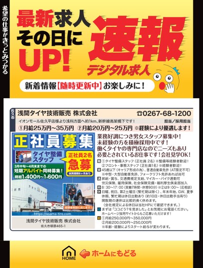 最新求人その日にUP!デジタル求人速報新着情報【随時更新中】お楽しみに!浅間タイヤ技術販売株式会社☎0267-68-1200担当/採用担当イオンモール佐久平店様より浅科方面へ約1km、新幹線高架橋下です!①月給25万円〜35万円②月給20万円〜25万円※経験により優遇します!希望の仕事がきっとみつかる希望の仕事がきっとみつかる佐久市正社員タイヤ整備スタッフ3月中旬〜4月末までの短期アルバイト同時募集!時給1,400円〜1,600円募集急募正社員2名試用期間6ヶ月あり経験者相談に応じます!https://asama-tire.com浅間タイヤ技術販売株式会社佐久市塚原465-1業務好調につき男女スタッフ募集中!未経験の方を積極採用中です!働くタイヤの専門店なのでニーズもあり必要とされているお仕事です!会社見学OK!①タイヤ整備スタッフ(正社員2名)※整備等経験者歓迎!②フロント・事務スタッフ(正社員1名)※経験者歓迎!45歳以下(キャリア形成の為)、普通自動車免許(AT限定不可)※中型・大型自動車免許、フォークリフト免許あれば尚可昇給・賞与、交通費規定支給、マイカー・バイク通勤可労災保険、雇用保険、社会保険完備・福利厚生倶楽部加入8:30〜17:00(実働7時間・休憩90分)※②は9:00〜(応相談)日曜、祝日、第2土曜日(繁忙期は除く)、年末年始、GW、夏季休暇、繁忙期は休日出勤あり(約10日・休日出勤手当有り)閑散期の連休は比較的長く休めます。(会社規定による休日は当社HPにて確認できます。)まずは「ココどう?を見ました」とお気軽にお電話ください。ホームページ採用サイトからもご応募いただけます!①月給250,000円〜350,000円②月給200,000円〜250,000円※年齢・経験によりスタート給与が変わります。