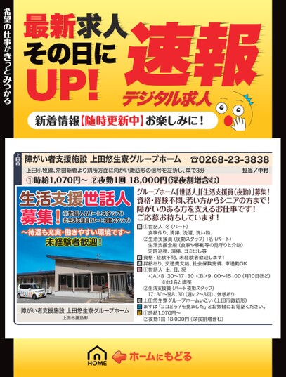 最新求人その日にUP!デジタル求人速報新着情報【随時更新中】お楽しみに!障がい者支援施設上田悠生寮グループホーム☎0268-23-3838上田小牧線、常田新橋より別所方面に向かい諏訪形の信号を左折し、車で3分①時給1,070円〜②夜勤1回18,000円(深夜割増含む)担当/中村希望の仕事がきっとみつかる希望の仕事がきっとみつかる上田市生活支援世話人募集!①世話人(パートスタッフ)②生活支援員(パート夜勤スタッフ)〜待遇も充実・働きやすい環境です〜未経験者歓迎!障がい者支援施設上田悠生寮グループホーム上田市諏訪形グループホーム「世話人」生活支援員(夜勤)」募集!資格・経験不問、若い方からシニアの方まで!障がいのある方を支えるお仕事です!ご応募お待ちしています!①世話人1名(パート)食事作り、清掃、洗濯、洗い物、②生活支援員(夜勤スタッフ)1名(パート)生活支援全般(食事や移動等の見守りと介助)定時巡視、清掃、ゴミ出し等資格・経験不問、未経験者歓迎します!昇給あり、交通費支給、社会保険完備、車通勤OK①世話人:土、日、祝<A>8:30〜17:30<B>9:00〜15:00(月10日ほど)※他1名と調整②生活支援員(パート夜勤スタッフ)17:30〜翌8:30(週に2〜3回)、休憩あり上田悠生寮グループホームいこい(上田市諏訪形)まずは「ココどう?を見ました」とお気軽にお電話ください。①時給1,070円〜②夜勤1回18,000円(深夜割増含む)