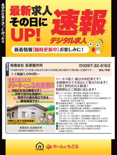 最新求人その日にUP!デジタル求人速報新着情報【随時更新中】お楽しみに!有限会社荻原製作所R18御代田町「三ツ谷東」交差点から車で3分程度。緑に囲まれて落ち着いた場所です!①②時給1,090円〜☎0267-32-6163担当/荻原希望の仕事がきっとみつかる希望の仕事がきっとみつかる御代田町業務好調につきパートさん3名急募!9割が女性の職場です!子育て世代も活躍中!育児や介護を両立できる職場環境です!内職さん若干名同時募集!※詳しくはお問い合わせください。有限会社荻原製作所御代田町大字馬瀬口1670-110ハーネス加工・組立のお仕事です!未経験の方でも安心して覚えられます!子育て世代の方大歓迎!時間帯などご相談に応じます!①ハーネス加工・資材管理・検査員(正社員3名)②ハーネス加工・資材管理・検査員(パート3名)※ハーネスとは、自動車や産業機械に欠かせない配線部品です。「配線の束」の加工作業です。未経験者大歓迎!①45歳まで(省令3号のイ)②年齢不問※幅広い年代層が活躍中!①昇給あり、各種保険完備、制服貸与、交通費規定支給②制服貸与、交通費規定支給、社員登用制度あり①8:15〜17:20②8:15〜17:20の間で、1日5時間から働ける方※9:00〜17:00の間で、1日5時間から働ける方でもOK!※時間帯などご相談に応じます!※フルタイム希望もOK!週休2日制、GW、お盆、年末年始まずは「ココどう?を見ました」とお気軽にお電話ください。①時給1,090円×8時間×22日=月額191,840円②時給1,090円〜
