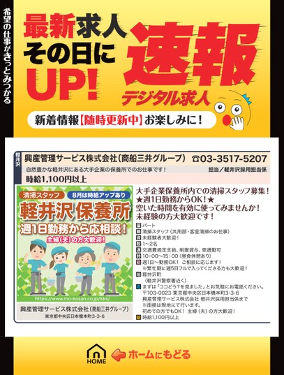 最新求人その日にUP!デジタル求人速報新着情報【随時更新中】お楽しみに!希望の仕事がきっとみつかる希望の仕事がきっとみつかる☎03-3517-5207担当/軽井沢採用担当係興産管理サービス株式会社(商船三井グループ)自然豊かな軽井沢にある大手企業の保養所でのお仕事です!時給1,100円以上軽井沢清掃スタッフ8月は時給アップあり軽井沢保養所週1日勤務から応相談!主婦(夫)の方大歓迎!https://www.mo-kosan.co.jp/kks/興産管理サービス株式会社(商船三井グループ)東京都中央区日本橋本町3-3-6大手企業保養所内での清掃スタッフ募集!★週1日勤務からOK!★空いた時間を有効に使ってみませんか!未経験の方大歓迎です!パート清掃スタッフ(共用部・客室清掃のお仕事)未経験者大歓迎!1〜2名交通費規定支給、制服貸与、車通勤可10:00〜15:00(昼食休憩あり)週1日〜勤務OK!ご相談に応じます!※繁忙期に週5日フルで入ってくださる方も大歓迎!軽井沢町(軽井沢警察署近く)まずは「ココどう?を見ました」とお気軽にお電話ください。〒103-0023東京都中央区日本橋本町3-3-6興産管理サービス株式会社軽井沢採用担当係まで※面接は現地にて行います。初めての方でもOK!主婦(夫)の方大歓迎!時給1,100円以上