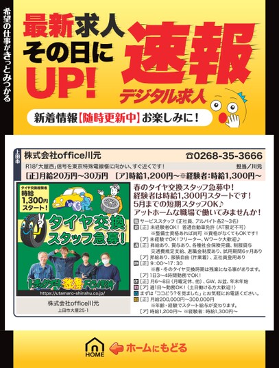 最新求人その日にUP!デジタル求人速報新着情報【随時更新中】お楽しみに!株式会社office川元☎0268-35-3666R18「大屋西」信号を東京特殊電線様に向かい、すぐ近くです!担当/川元[正]月給20万円〜30万円[ア]時給1,200円〜※経験者:時給1,300円〜希望の仕事がきっとみつかる希望の仕事がきっとみつかる上田市タイヤ交換経験者時給1,300円スタート!タイヤ交換スタッフ急募!https://utamaro-shinshu.co.jp/株式会社office川元上田市大屋25-1春のタイヤ交換スタッフ急募中!経験者は時給1,300円スタートです!5月までの短期スタッフOK♪アットホームな職場で働いてみませんか!サービススタッフ(正社員、アルバイト各2〜3名)[正]未経験者OK!普通自動車免許(AT限定不可)※整備士資格あれば尚可※資格がなくてもOKです![ア]未経験でOK!フリーター、Wワーク大歓迎♪[正]昇給あり、賞与あり、各種社会保険完備、制服貸与交通費規定支給、退職金制度あり、試用期間6ヶ月あり[ア]昇給あり、服装自由(作業着)、正社員登用あり[正]9:00〜17:30※春・冬のタイヤ交換時期は残業になる事があります。[ア]1日3〜4時間勤務でOK![正]月6〜8日(月曜定休、他)、GW、お盆、年末年始[ア]週1日〜勤務OK!(土日働ける方大歓迎!)まずは「ココどう?を見ました」とお気軽にお電話ください。[正]月給200,000円〜300,000円※年齢・経験でスタート給与が変わります。[ア]時給1,200円〜※経験者:時給1,300円〜