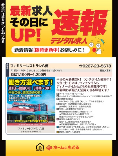 最新求人その日にUP!デジタル求人速報新着情報【随時更新中】お楽しみに!希望の仕事がきっとみつかる希望の仕事がきっとみつかる☎0267-23-5678担当/宮本ファミリーレストラン八億R18沿い、カラオケまねきねこ小諸店様すぐ近くです!時給1,100円〜1,250円小諸市働き方選べます!週1日〜勤務OK!3時間〜OK!平日のみ、週末のみOK!タブレットオーダーの為料理のお届けと、お皿の片付けがメインです♪楽しく簡単なお仕事です♪学生からシニアまで活躍できます♪https://www.hachioku.net/ファミリーレストラン八億小諸市大字滋野甲1197-3平日のみ勤務OK!ランチタイム募集中!<金・土・日>は、ランチタイムもディナータイムもどちらも募集中です!年齢問わず幅広く活躍できる環境です♪パート・アルバイト(3〜4名)ホールスタッフ(基本はホールメインですが付随する業務あり)未経験者大歓迎!※Wワーク、学生、主婦(夫)、シニアの方も活躍中♪昇給あり、交通費規定支給、制服貸与食事補助(規定あり)、社会保険完備1日3〜4時間勤務でOKです!★勤務時間はお気軽にご相談下さい♪★平日のみのママさんも歓迎です!★週末のみのWワークや学生さんもOK!週1日から勤務OKです!★たくさん働きたい方も大歓迎です♪★正社員同時募集中♪月給200,000円〜まずは「ココどう?を見ました」とお気軽にお電話ください。※ご応募は、本社:宮本物産株式会社で受付けます。時給1,100円〜1,250円