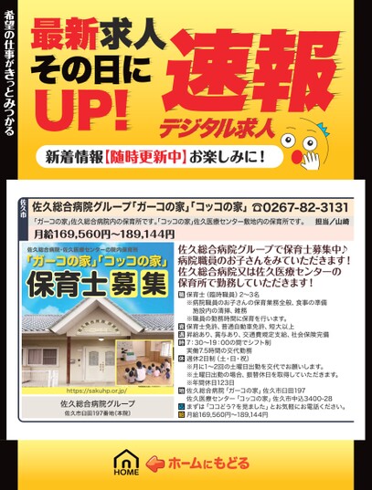 最新求人その日にUP!デジタル求人速報新着情報【随時更新中】お楽しみに!佐久総合病院グループ「ガーコの家」コッコの家」☎0267-82-3131「ガーコの家」佐久総合病院内の保育所です。コッコの家」佐久医療センター敷地内の保育所です。月給169,560円〜189,144円担当/山崎希望の仕事がきっとみつかる希望の仕事がきっとみつかる佐久市佐久総合病院・佐久医療センターの院内保育所「ガーコの家」コッコの家」保育士募集https://sakuhp.or.jp/佐久総合病院グループ佐久市臼田197番地(本院)佐久総合病院グループで保育士募集中♪病院職員のお子さんをみていただきます!佐久総合病院又は佐久医療センターの保育所で勤務していただきます!保育士(臨時職員)2〜3名※病院職員のお子さんの保育業務全般、食事の準備施設内の清掃、雑務※職員の勤務時間に保育を行います。保育士免許、普通自動車免許、短大以上昇給あり、賞与あり、交通費規定支給、社会保険完備7:30〜19:00の間でシフト制実働7.5時間の交代勤務週休2日制(土・日・祝)※月に1〜2回の土曜日出勤を交代でお願いします。※土曜日出勤の場合、振替休日を取得していただきます。※年間休日123日佐久総合病院「ガーコの家」佐久市臼田197佐久医療センター「コッコの家」佐久市中込3400-28まずは「ココどう?を見ました」とお気軽にお電話ください。月給169,560円〜189,144円