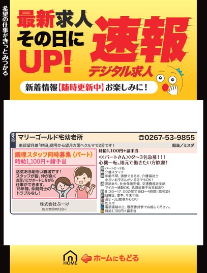 最新求人その日にUP!デジタル求人速報新着情報【随時更新中】お楽しみに!マリーゴールド宅幼老所東部望月線「畔田」信号から望月方面へクルマで2分です!☎0267-53-9855担当/ミスダ調理スタッフ同時募集(パート)時給1,100円+諸手当活気ある明るい職場です!スタッフが皆、仲が良くお互いにサポートしながら仕事ができます。15年間、仲間同士のトラブルなし!株式会社ぶーけ佐久市印内133-1時給1,100円+諸手当<<パートさん>>2〜3名急募!!!心機一転、地元で働きたい方歓迎!パート2〜3名介護スタッフ年齢不問、通勤できる方、介護福祉士小さいお子さんがいる方でもOK!昇給あり、社会保険完備、交通費規定支給マイカー通勤OK、処遇改善手当支給あり8:30〜17:00の間で1日3〜4時間(応相談)日曜日、夏季、年末年始週2〜3日勤務からOK!佐久市電話連絡の上、履歴書持参でお越しください。時給1,100円+諸手当希望の仕事がきっとみつかる希望の仕事がきっとみつかる佐久市