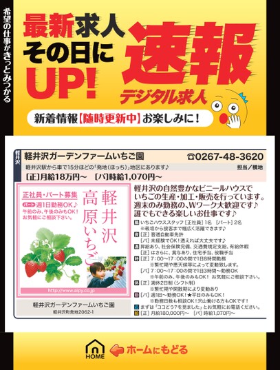 最新求人その日にUP!デジタル求人速報新着情報【随時更新中】お楽しみに!軽井沢ガーデンファームいちご園軽井沢駅から車で15分ほどの「発地(ほっち)」地区にあります♪[正]月給18万円〜[パ]時給1,070円〜☎0267-48-3620担当/横地希望の仕事がきっとみつかる希望の仕事がきっとみつかる軽井沢軽井沢の自然豊かなビニールハウスでいちごの生産・加工・販売を行っています。週末のみ勤務の、Wワーク大歓迎です♪誰でもできる楽しいお仕事です♪いちごハウススタッフ[正社員]1名[パート]2名※栽培から接客まで幅広く活躍できます♪[正]普通自動車免許[パ]未経験でOK!通えれば大丈夫です♪昇給あり、社会保険完備、交通費規定支給、有給休暇[正]はさらに、賞与あり、住宅手当、役職手当[正]7:00〜17:00の間で1日8時間勤務※繁忙期や悪天候等によって変動致します。[パ]7:00〜17:00の間で1日3時間〜勤務OK※午前のみ、午後のみもOK!お気軽にご相談下さい。[正]週休2日制(シフト制)※繁忙期や閑散期により変動あり[パ]週1日〜勤務OK!★平日のみもOK!※勤務日数も相談OK!沢山働ける方もOKです!まずは「ココどう?を見ました」とお気軽にお電話ください。[正]月給180,000円〜[パ]時給1,070円〜軽井沢高原正社員・パート募集週1日勤務OK♪パート午前のみ、午後のみもOK!お気軽にご相談下さい。http://www.aipy.co.jp軽井沢ガーデンファームいちご園軽井沢町発地2062-1