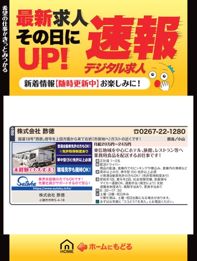 最新求人その日にUP!デジタル求人速報新着情報【随時更新中】お楽しみに!希望の仕事がきっとみつかる希望の仕事がきっとみつかる小諸市株式会社酢徳国道18号「西原」信号を上田方面から来て右折(市街地へ)ガストの近くです!☎0267-22-1280担当/小山普通自動車免許の方もOK!※免許取得制度あり準中型(5t)免許以上必須未経験でも大丈夫!職場見学も随時OK!業界未経験の方でもOKです!先輩社員がサポートするので安心!https://www.sutoku.info/株式会社酢徳小諸市市町5-4-18月給20万円〜24万円東信地域を中心にホテル、旅館、レストラン等へ業務用食品を配送するお仕事です!正社員1〜2名配送ドライバー商品の配達、倉庫内でのピッキングや積込み、倉庫内の清掃など高卒以上の方、準中型(5t)免許以上必須※普通自動車免許の方もOK!(免許取得制度あり)昇給年1回、賞与年2回、社会保険完備、制服貸与マイカー通勤OK、通勤手当(規定により)支給退職金制度あり、精勤手当あり、家族手当あり8:30〜17:30土曜・日曜・祝日休み※繁忙期は、土曜・祝日出勤になる場合があります。まずはお気軽に「ココどう?を見た」とお電話ください。