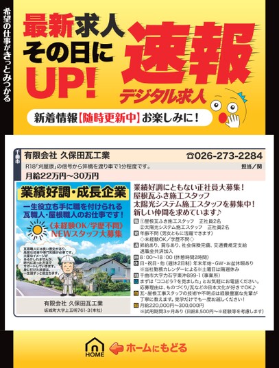 最新求人その日にUP!デジタル求人速報新着情報【随時更新中】お楽しみに!希望の仕事がきっとみつかる希望の仕事がきっとみつかる☎026-273-2284担当/関有限会社久保田瓦工業R18「刈屋原」の信号から笄橋を渡り車で1分程度です。月給22万円〜30万円千曲市業績好調・成長企業一生役立ち手に職を付けられる瓦職人・屋根職人のお仕事です!《未経験OK/学歴不問》NEWスタッフ大募集瓦葺職人には長い歴史があり、高度な技術や専門知識が必要です。大変なイメージがあるかしれませんが、時代にあった方法でサポートしていきます。身に付けた技術は、一生涯ずっと役立ちます。有限会社久保田瓦工業坂城町大字上五明761-3(本社)業績好調にともない正社員大募集!屋根瓦ふき施工スタッフ太陽光システム施工スタッフを募集中!新しい仲間を求めています♪①屋根瓦ふき施工スタッフ正社員2名②太陽光システム施工スタッフ正社員2名年齢不問(男女ともに活躍できます)◇未経験OK/学歴不問◇昇給あり、賞与あり、社会保険完備、交通費規定支給退職金共済加入8:00〜18:00(休憩時間2時間)日・祝日・他(週休2日制)年末年始・GW・お盆休暇あり※当社勤務カレンダーによる※土曜日は隔週休み千曲市大字力石字東沖899-1(事業所)まずは「ココどう?を見ました」とお気軽にお電話ください。応募理由は、ものづくり/瓦などの日本文化が好きでOK♪瓦・屋根工事スタッフの技術や不明点は経験豊富な先輩が丁寧に教えます。見学だけでも一度お越しください!月給220,000円〜300,000円※試用期間3ヶ月あり(日給8,500円〜※経験等を考慮します)