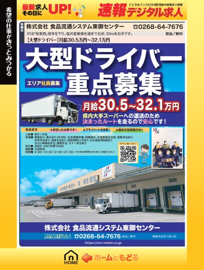 最新求人その日にUP!速報発刊前の速報求人情報デジタルブックだけのデジタル求人☎0268-64-7676担当/新村【大型ドライバー】月給30.5万円〜32.1万円大型ドライバー重点募集エリア社員募集月給30.5〜32.1万円県内大手スーパーへの運送のため決まったルートを走るので安心です!R18「牧家西」信号を下り、塩沢産業様を過ぎて右折、50m先右手です。株式会社食品流通システム東御センター東御市希望の仕事がきっとみつかる募集要項人数●待遇●休日●資格●時間●★安定した仕事です!★プライベートも充実!★働き方改革実行中!各5〜10名昇給あり、賞与あり(年2回)、社会保険完備、制服貸与、交通費規定支給、皆勤手当あり住宅手当あり、家族手当あり、研修期間3ヶ月あり、正社員登用制度ありさらに無事故手当、乗務手当、マナー手当あり月8日〜9日(年間105日)大型免許4:30〜13:30・12:30〜21:30※その他の時間帯もあります。ご相談ください!HPもご覧ください株式会社食品流通システム東御センター「ココどう?を見ました」とお気軽にお電話ください!☎0268-64-7676https://srs-meito.co.jp担当/新村東御市加沢138-26