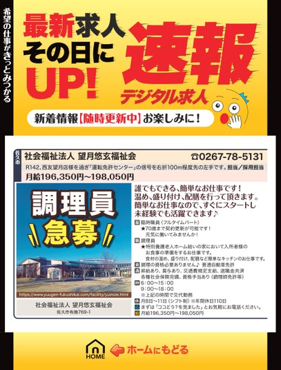 最新求人その日にUP!デジタル求人速報新着情報【随時更新中】お楽しみに!希望の仕事がきっとみつかる希望の仕事がきっとみつかる佐久市社会福祉法人望月悠玄福祉会☎0267-78-5131R142、西友望月店様を過ぎ「運転免許センター」の信号を右折100m程度先の左手です。担当/採用担当月給196,350円〜198,050円調理員急募https://www.yuugen-fukushikai.com/facility/yuinoie.html社会福祉法人望月悠玄福祉会佐久市布施769-1誰でもできる、簡単なお仕事です!温め、盛り付け、配膳を行って頂きます。簡単なお仕事なので、すぐにスタートし未経験でも活躍できます♪臨時職員(フルタイムパート)★70歳まで契約更新が可能です!元気に働いてみませんか!調理員★特別養護老人ホーム結いの家において入所者様のお食事の準備をするお仕事です。食材の温め、盛り付け、配膳など簡単なキッチンのお仕事です。調理の資格必要ありません♪普通自動車免許昇給あり、賞与あり、交通費規定支給、退職金共済各種社会保険完備、資格手当あり(調理師免許等)6:00〜15:009:00〜18:00※上記の時間で交代勤務月8日〜11日(シフト制)※年間休日110日まずは「ココどう?を見ました」とお気軽にお電話ください。月給196,350円〜198,050円