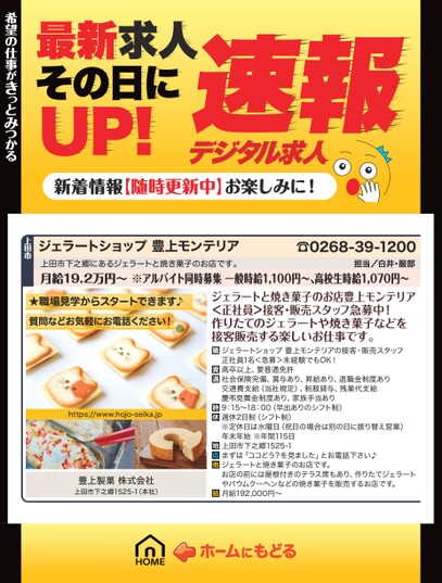 最新求人その日にUP!デジタル求人速報新着情報【随時更新中】お楽しみに!ジェラートショップ豊上モンテリア☎0268-39-1200上田市下之郷にあるジェラートと焼き菓子のお店です。月給19.2万円〜※アルバイト同時募集一般時給1,100円〜、高校生時給1,070円〜担当/白井・服部希望の仕事がきっとみつかる希望の仕事がきっとみつかる上田市★職場見学からスタートできます♪質問などお気軽にお電話ください!https://www.hojo-seika.jp豊上製菓株式会社上田市下之郷1525-1(本社)ジェラートと焼き菓子のお店豊上モンテリア<正社員>接客・販売スタッフ急募中!作りたてのジェラートや焼き菓子などを接客販売する楽しいお仕事です。ジェラートショップ豊上モンテリアの接客・販売スタッフ正社員1名<急募>未経験でもOK!高卒以上、要普通免許社会保険完備、賞与あり、昇給あり、退職金制度あり交通費支給(当社規定)、制服貸与、残業代支給慶弔見舞金制度あり、家族手当あり9:15〜18:00(早出ありのシフト制)週休2日制(シフト制)※定休日は水曜日(祝日の場合は別の日に振り替え営業)年末年始※年間115日上田市下之郷1525-1まずは「ココどう?を見ました」とお電話下さい♪ジェラートと焼き菓子のお店です。お店の前には屋根付きのテラス席もあり、作りたてジェラートやバウムクーヘンなどの焼き菓子を販売するお店です。月給192,000円〜