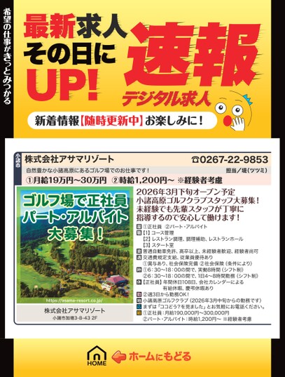 最新求人その日にUP!デジタル求人速報新着情報【随時更新中】お楽しみに!株式会社アサマリゾート☎0267-22-9853担当/堤(ツツミ)自然豊かな小諸高原にあるゴルフ場でのお仕事です!①月給19万円〜30万円②時給1,200円〜※経験者考慮ゴルフ場で正社員パート・アルバイト大募集!https://asama-resort.co.jp/株式会社アサマリゾート小諸市加増3-8-432F2026年3月下旬オープン予定小諸高原ゴルフクラブスタッフ大募集!未経験でも先輩スタッフが丁寧に指導するので安心して働けます!①正社員②パート・アルバイト【1】コース管理【2】レストラン調理、調理補助、レストランホール【3】スタート室普通自動車免許、高卒以上、未経験者歓迎、経験者尚可交通費規定支給、従業員優待あり①賞与あり、社会保険完備②社会保険(条件により)①6:30〜18:00の間で、実働8時間(シフト制)②6:30〜18:00の間で、1日4〜8時間勤務(シフト制)【正社員】年間休日108日、会社カレンダーによる有給休暇、慶弔休暇あり②週3日から勤務OK!小諸高原ゴルフクラブ(2026年3月中旬からの勤務です)まずは「ココどう?を見ました」とお気軽にお電話ください。①正社員:月給190,000円〜300,000円②パート・アルバイト:時給1,200円〜※経験者考慮希望の仕事がきっとみつかる希望の仕事がきっとみつかる小諸市