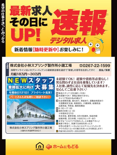 最新求人その日にUP!デジタル求人速報新着情報【随時更新中】お楽しみに!株式会社小林スプリング製作所小諸工場浅間サンライン沿いセブン-イレブン小諸新家店様を過ぎて「新家」の信号を右折してすぐ月給18万円〜30万円☎0267-22-1599担当/荻原希望の仕事がきっとみつかる希望の仕事がきっとみつかる小諸市NEWスタッフ業務拡大に向け大募集年間休日121日!プライベート充実!パートさんもお気軽にご相談下さい♪https://www.kobayashi-sp.co.jp/株式会社小林スプリング製作所小諸工場小諸市大字滋野甲3942-1未経験でOK!経験や資格等必要なし!男女問わず正社員を募集しています♪入社後、適性に応じて配属先を決めます。安心してご応募下さい♪製造スタッフ(正社員5〜10名)未経験でOK!資格必要ありませんキャリア形成の為40歳以下社会保険完備、賞与あり、昇給あり、退職金制度あり交通費規定支給、制服貸与、介護保険、結婚祝金出産祝金、弔慰金、傷病見舞金8:00〜17:00週休2日制(土・日)※年間休日121日年末年始、夏季休暇、5月大型連休、有給休暇結婚休暇、忌引休暇、※会社カレンダーありまずは「ココどう?を見ました」とお電話下さい♪素直で明るく、笑顔で主体性を持った方好奇心旺盛で、いろんなことにチャレンジしたい方やりすぎるくらいの行動力を持った方を歓迎します!月給180,000円〜300,000円