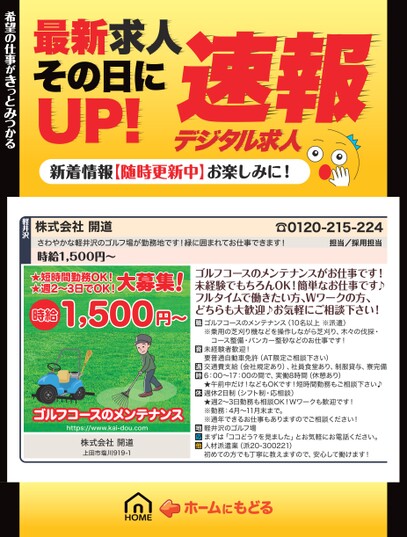 最新求人その日にUP!デジタル求人速報新着情報【随時更新中】お楽しみに!株式会社開道さわやかな軽井沢のゴルフ場が勤務地です!緑に囲まれてお仕事できます!時給1,500円〜☎0120-215-224担当/採用担当希望の仕事がきっとみつかる希望の仕事がきっとみつかる軽井沢★短時間勤務OK!★週2〜3日でOK!時給1,500円〜ゴルフコースのメンテナンスhttps://www.kai-dou.com株式会社開道上田市塩川919-1ゴルフコースのメンテナンスがお仕事です!未経験でもちろんOK!簡単なお仕事です♪フルタイムで働きたい方、Wワークの方、どちらも大歓迎♪お気軽にご相談下さい!ゴルフコースのメンテナンス(10名以上※派遣)※乗用の芝刈り機などを操作しながら芝刈り、木々の伐採・コース整備・バンカー整砂などのお仕事です!未経験者歓迎!要普通自動車免許(AT限定ご相談下さい)交通費支給(会社規定あり)、社員食堂あり、制服貸与、寮完備6:00〜17:00の間で、実働8時間(休憩あり)★午前中だけ!などもOKです!短時間勤務もご相談下さい♪週休2日制(シフト制・応相談)★週2〜3日勤務も相談OK!Wワークも歓迎です!※勤務:4月〜11月末まで。※通年できるお仕事もありますのでご相談ください!軽井沢のゴルフ場まずは「ココどう?を見ました」とお気軽にお電話ください。人材派遣業(派20-300221)初めての方でも丁寧に教えますので、安心して働けます!