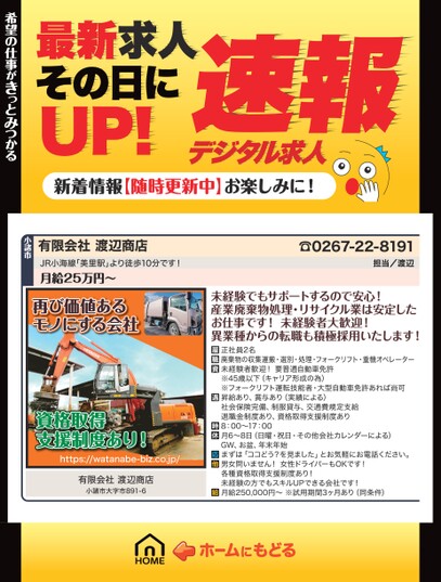 最新求人その日にUP!デジタル求人速報新着情報【随時更新中】お楽しみに!希望の仕事がきっとみつかる希望の仕事がきっとみつかる☎0267-22-8191担当/渡辺未経験でもサポートするので安心!産業廃棄物処理・リサイクル業は安定したお仕事です!未経験者大歓迎!異業種からの転職も積極採用いたします!正社員2名廃棄物の収集運搬・選別・処理・フォークリフト・重機オペレーター未経験者歓迎!要普通自動車免許※45歳以下(キャリア形成の為)※フォークリフト運転技能者・大型自動車免許あれば尚可昇給あり、賞与あり(実績による)社会保険完備、制服貸与、交通費規定支給退職金制度あり、資格取得支援制度あり8:00〜17:00月6〜8日(日曜・祝日・その他会社カレンダーによる)GW、お盆、年末年始まずは「ココどう?を見ました」とお気軽にお電話ください。男女問いません!女性ドライバーもOKです!各種資格取得支援制度あり!未経験の方でもスキルUPできる会社です!月給250,000円〜※試用期間3ヶ月あり(同条件)有限会社渡辺商店JR小海線「美里駅」より徒歩10分です!月給25万円〜小諸市再び価値あるモノにする会社資格取得支援制度あり!https://watanabe-biz.co.jp/有限会社渡辺商店小諸市大字市891-6