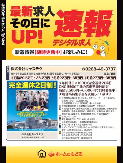 最新求人その日にUP!デジタル求人速報新着情報【随時更新中】お楽しみに!株式会社キャステク☎0268-49-3737担当/長澤R143号を上田市街から約15分「青木」信号を左折し、青木小学校近く①月給20.5万円〜36.2万円②月給22万円〜35万円③月給27万円〜35万円希望の仕事がきっとみつかる希望の仕事がきっとみつかる青木村完全週休2日制!未経験からのスタートが多く活躍!資格取得から先輩社員のサポートが安心!ぜひ、工場見学にお越しください!https://www.castec.co.jp/株式会社キャステク【本社】青木村大字夫神1282<年間休日>120日(完全週休2日制)CNC機械加工機の高度熟練技能者時給3,500円〜6,000円で同時募集中!★物価高特別手当を支給しています♪①機械加工NC旋盤、マシニングオペレーター(正社員)2名②営業スタッフ(正社員)2名③品質管理スタッフ(正社員)1名※経験者普通自動車免許※未経験からのスタートでOK!昇給・賞与あり、社会保険完備、交通費全額支給、物価高手当制服貸与、退職金制度あり、資格手当、皆勤手当、精勤手当家族手当、役職手当、時間外勤務手当、有給休暇あり8:00〜17:00完全週休2日制、GW、お盆、年末年始※年間休日120日有給取得率8割以上本社工場(青木村大字夫神1282)まずは「ココどう?を見ました」とお気軽にお電話ください。ぜひ、工場見学にお越しください!①月給205,000円〜362,000円②月給220,000円〜350,000円③月給270,000円〜350,000円