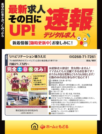 最新求人その日にUP!デジタル求人速報新着情報【随時更新中】お楽しみに!リハビリテーション颯うえだ下小島信号角のセブン-イレブン上田小島店様より車で1分月給21.7万円〜☎0268-71-7261担当/柳沢希望の仕事がきっとみつかる希望の仕事がきっとみつかる上田市完全土日祝休み!ウチどうですか?介護の「楽しみ」がここにある!一度体験してみて!職場見学OKです!年間休日128日https://kaedenokaze.com/rehabiliday/株式会社さかきの杜みち上田市小島268-4未経験者大歓迎!男女問いません!ママさんでも大活躍できるお仕事です♪お子さんの急な発熱などもちろん対応します♪日勤のみのお仕事なので安心です!介護職員(正社員・若干名)普通自動車免許昇給あり、賞与あり(昨年実績4.4ヶ月)、社会保険完備資格手当あり(月20,000円から)、交通費支給※福利厚生、充実しています♪8:30〜17:30週休2日制(土・日・祝)お盆、年末年始、年間休日128日でプライベートも充実!まずは「ココどう?を見ました」とお気軽にお電話ください。職場見学もOK!です。一度職場を見てみたい。お話をお聞きしたい!そんなあなたのご連絡お待ちしています。いろいろなご相談にお応じます!送迎があるお仕事ですが安心してください!★ドライブレコーダー★全車ナビ付★自動ブレーキシステム搭載車です!月給217,000円〜
