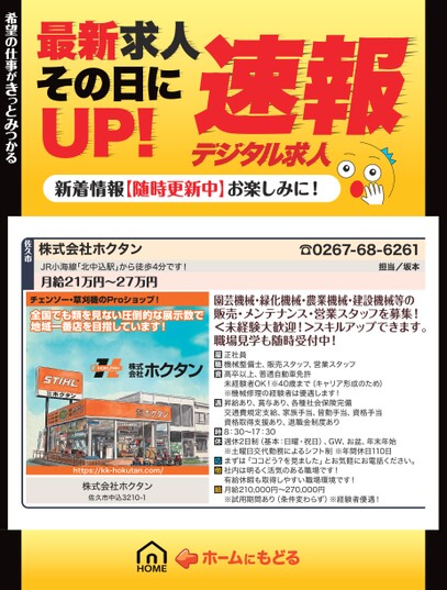 最新求人その日にUP!デジタル求人速報新着情報【随時更新中】お楽しみに!希望の仕事がきっとみつかる希望の仕事がきっとみつかる☎0267-68-6261担当/坂本園芸機械・緑化機械・農業機械・建設機械等の販売・メンテナンス・営業スタッフを募集!<未経験大歓迎!>スキルアップできます。職場見学も随時受付中!正社員機械整備士、販売スタッフ、営業スタッフ高卒以上、普通自動車免許未経験者OK!※40歳まで(キャリア形成のため)※機械修理の経験者は優遇します!昇給あり、賞与あり、各種社会保険完備交通費規定支給、家族手当、皆勤手当、資格手当資格取得支援あり、退職金制度あり8:30〜17:30週休2日制(基本:日曜・祝日)、GW、お盆、年末年始※土曜日交代勤務によるシフト制※年間休日110日まずは「ココどう?を見ました」とお気軽にお電話ください。社内は明るく活気のある職場です!有給休暇も取得しやすい職場環境です!月給210,000円〜270,000円※試用期間あり(条件変わらず)※経験者優遇!JR小海線「北中込駅」から徒歩4分です!月給21万円〜27万円チェンソー・草刈機のProショップ!全国でも類を見ない圧倒的な展示数で地域一番店を目指しています!株式会社ホクタン佐久市https://kk-hokutan.com/株式会社ホクタン佐久市中込3210-1