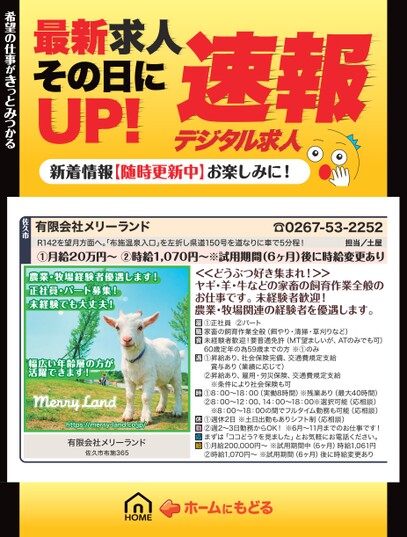最新求人その日にUP!デジタル求人速報新着情報【随時更新中】お楽しみに!希望の仕事がきっとみつかる希望の仕事がきっとみつかる佐久市有限会社メリーランド☎0267-53-2252担当/土屋R142を望月方面へ。布施温泉入口」を左折し県道150号を道なりに車で5分程!①月給20万円〜②時給1,070円〜※試用期間(6ヶ月)後に時給変更あり農業・牧場経験者優遇します!正社員・パート募集!未経験でも大丈夫!幅広い年齢層の方が活躍できます!https://merry-land.co.jp/有限会社メリーランド佐久市布施365<<どうぶつ好き集まれ!>>ヤギ・羊・牛などの家畜の飼育作業全般のお仕事です。未経験者歓迎!農業・牧場関連の経験者を優遇します。①正社員②パート家畜の飼育作業全般(やり・清掃・草刈りなど)未経験者歓迎!要普通免許(MT望ましいが、ATのみでも可)60歳定年の為59歳までの方※①のみ①昇給あり、社会保険完備、交通費規定支給賞与あり(業績に応じて)②昇給あり、雇用・労災保険、交通費規定支給※条件により社会保険も可①8:00〜18:00(実働8時間)※残業あり(最大40時間)②8:00〜12:00、14:00〜18:00※選択可能(応相談)※8:00〜18:00の間でフルタイム勤務も可能(応相談)①週休2日※土日出勤もありシフト制(応相談)②週2〜3日勤務からOK!※6月〜11月までのお仕事です!まずは「ココどう?を見ました」とお気軽にお電話ください。①月給200,000円〜※試用期間中(6ヶ月)時給1,061円②時給1,070円〜※試用期間(6ヶ月)後に時給変更あり