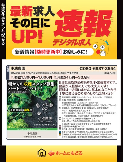 最新求人その日にUP!デジタル求人速報新着情報【随時更新中】お楽しみに!希望の仕事がきっとみつかる希望の仕事がきっとみつかる小海町小池農園☎080-6937-3554担当/小池R141「松原湖入口」の信号を臼田方面から向かい右折してスグです!①時給1,300円〜1,600円②月給24万円〜33万円朝からの収穫スタッフ募集!パート・アルバイト!週1日から勤務OK!正社員同時募集中「ありがとう」を野菜に込めてhttps://www.koike-nouen.com/小池農園小海町大字豊里3415仕事は高原野菜の生産管理・出荷業務です。農業が未経験の方でも大丈夫です!経験は一切問いません。基本的なことから丁寧に教えるので安心してくださいね♪高原野菜の収穫スタッフ①パート・アルバイト②正社員年齢・学歴不問、未経験者歓迎!普通自動車免許(正社員はAT限定不可)※AT限定の方でも資格取得制度があるので安心して下さい♪昇給あり、交通費規定支給、車貸与可、朝食支給ありカッパ・長靴・作業着支給します!②正社員は更に、賞与あり(昨年は100万円以上の実績あり♪)社会保険完備、住宅手当あり、有給休暇あり①4:00〜1日2時間から勤務OKです!②4:00〜17:00の実働8時間(休憩あり)※朝は4:00からの出勤ですが夕方は融通がききます♪①週1日から勤務OKです!②月4〜8日程度(応相談)別途夏季・年末休暇ありまずは「ココどう?を見ました」とお気軽にお電話ください。①時給1,300円〜1,600円②月給240,000円〜330,000円※正社員は年齢、家族構成を考慮し給与を支給致します。