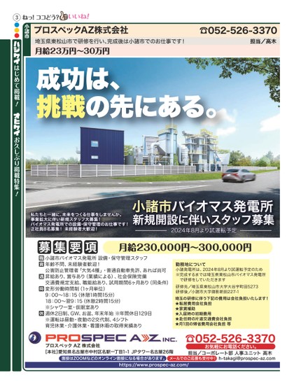 ☎052-526-3370担当/高木プロスペックAZ株式会社埼玉県東松山市で研修を行い、完成後は小諸市でのお仕事です!月給23万円〜30万円小諸市ねっ!ココどう?3●●●私たちと一緒に、未来をつくる仕事をしませんか。事業拡大に伴い新規スタッフ大募集!バイオマス発電所での設備・保守管理のお仕事です!正社員8名募集!未経験者大歓迎!小諸市バイオマス発電所新規開設に伴いスタッフ募集2024年8月より試運転予定成功は、挑戦の先にある。はじめて掲載!お久しぶり掲載特集!募集要項月給230,000円〜300,000円[本社]愛知県名古屋市中村区名駅一丁目1-1JPタワー名古屋26階面接はZOOMなどのオンライン面接になる場合があります。メールでのご応募も受付中!h-takagi@prospec-az.comhttps://www.prospec-az.com/小諸市バイオマス発電所設備・保守管理スタッフ年齢不問、未経験者歓迎!公害防止管理者「大気4種」・普通自動車免許、あれば尚可昇給あり、賞与あり(業績による)、社会保険完備交通費規定支給、職能給あり、試用期間6ヶ月あり(同条件)変形労働時間制(1ヶ月単位)9:00〜18:15(休憩1時間15分)18:00〜翌9:15(休憩2時間15分)※シャワー室・仮眠室あり週休2日制、GW、お盆、年末年始※年間休日129日※運転は昼勤・夜勤の2交代制、4シフト育児休業・介護休業・看護休暇の取得実績あり勤務地について小諸発電所は、2024年8月より試運転予定のため※完成するまでは埼玉県東松山市バイオマス発電所で研修をしていただきます研修先/埼玉県東松山市大字大谷宇町田5273研修後/小諸市大字御影新田227-1埼玉の研修に伴う下記の費用は会社負担いたします!★転居費用会社負担★家賃補助★入居時の初期費用★赴任時の片道交通費会社負担★月1回の帰省費用会社負担等☎052-526-3370お気軽にお電話ください。担当/コーポレート部人事ユニット高木