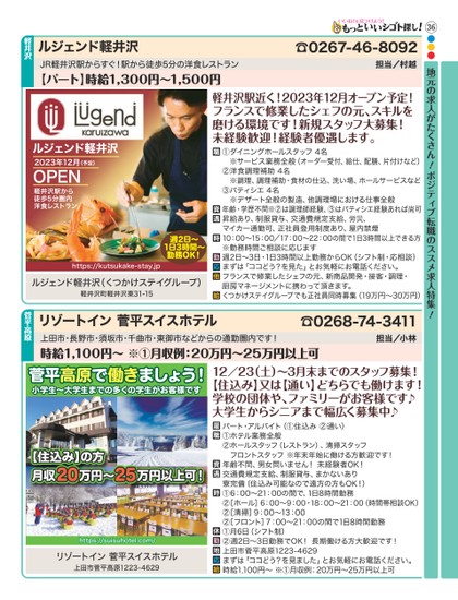 ●●●36地元の求人がたくさん!ポジティブ転職のススメ求人特集!☎0267-46-8092担当/村越JR軽井沢駅からすぐ!駅から徒歩5分の洋食レストラン【パート】時給1,300円〜1,500円ルジェンド軽井沢軽井沢2023年12月(予定)ルジェンド軽井沢OPEN軽井沢駅から徒歩5分圏内洋食レストラン週2日〜1日3時間〜勤務OK!https://kutsukake-stay.jpルジェンド軽井沢(くつかけステイグループ)軽井沢町軽井沢東31-15軽井沢駅近く!2023年12月オープン予定!フランスで修業したシェフの元、スキルを磨ける環境です!新規スタッフ大募集!未経験歓迎!経験者優遇します。①ダイニングホールスタッフ4名※サービス業務全般(オーダー受付、給仕、配膳、片付けなど)②洋食調理補助4名※調理、調理補助・食材の仕込、洗い場、ホールサービスなど③パティシエ4名※デザート全般の製造、他調理場における仕事全般年齢・学歴不問※②は調理師経験、③はパティシエ経験あれば尚可昇給あり、制服貸与、交通費規定支給、労災、マイカー通勤可、正社員登用制度あり、屋内禁煙10:00〜15:00/17:00〜22:00の間で1日3時間以上できる方※勤務時間ご相談に応じます週2日〜3日・1日3時間以上勤務からOK(シフト制・応相談)まずは「ココどう?を見た」とお気軽にお電話ください。フランスで修業したシェフの元、新商品開発・接客・調理・厨房マネージメントに携わって頂きます。くつかけステイグループでも正社員同時募集(19万円〜30万円)上田市・長野市・須坂市・千曲市・東御市などからの通勤圏内です!時給1,100円〜※①月収例:20万円〜25万円以上可菅平高原で働きましょう!小学生〜大学生までの多くの学生がお客様です12/23(土)〜3月末までのスタッフ募集!【住込み】又は【通い】どちらでも働けます!学校の団体や、ファミリーがお客様です♪大学生からシニアまで幅広く募集中♪【住込み】の方月収20万円〜25万円以上可!https://suisuhotel.com/リゾートイン菅平スイスホテル上田市菅平高原1223-4629パート・アルバイト(①住込み②通い)①ホテル業務全般②ホールスタッフ(レストラン)、清掃スタッフフロントスタッフ※年末年始に働ける方歓迎です!年齢不問、男女問いません!未経験者OK!交通費規定支給、制服貸与、まかないあり寮完備(住込み可能なので遠方の方もOK!)①6:00〜21:00の間で、1日8時間勤務②[ホール]6:00〜9:00・18:00〜21:00(時間帯相談OK)②[清掃]9:00〜13:00②[フロント]7:00〜21:00の間で1日8時間勤務①月6日(シフト制)②週2日〜3日勤務でOK!長期働ける方大歓迎です!上田市菅平高原1223-4629まずは「ココどう?を見ました」とお気軽にお電話ください。時給1,100円〜※①月収例:20万円〜25万円以上可☎0268-74-3411担当/小林リゾートイン菅平スイスホテル菅平高原