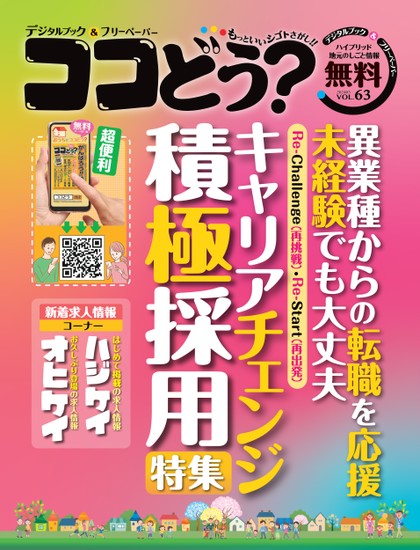 異業種からの転職を応援未経験でも大丈夫Re-Challenge(再挑戦)・Re-Start(再出発)積極採用キャリアチェンジ特集新着求人情報コーナーはじめて掲載の求人情報お久しぶり登場の求人情報超便利地元のしごと情報VOL.20240363無料