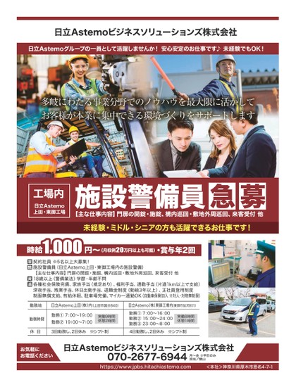 https://www.jpbs.hitachiastemo.com日立Astemoビジネスソリューションズ株式会社<本社>神奈川県厚木市恩名4-7-1担当/横山月∼金※平日のみ070-2677-6944お気軽にお電話ください1,000円∼・賞与年2回時給(月収例万円以上も可能)20契約社員※5名以上大募集!施設警備員(日立Astemo上田・東御工場内の施設警備)【主な仕事内容】門扉の開錠・施錠、構内巡回・敷地外周巡回、来客受付他18歳以上(警備業法)学歴・年齢不問各種社会保険完備、家族手当(規定あり)、福利手当、通勤手当(片道1km以上で支給)深夜手当、残業手当、休日出勤手当、退職金制度(勤続3年以上)、正社員登用制度制服無償支給、有給休暇、駐車場完備、マイカー通勤OK(自動車保険加入※対人・対物無制限)日立Astemoグループの一員として活躍しませんか!安心安定のお仕事です♪未経験でもOK!日立Astemoビジネスソリューションズ株式会社施設警備員工場内急募【主な仕事内容】門扉の開錠・施錠、構内巡回・敷地外周巡回、来客受付他日立Astemo上田・東御工場未経験・ミドル・シニアの方も活躍できるお仕事です!日立Astemo上田(株)内(上田市国分840)日立Astemo(株)東御工場内(東御市加沢801)勤務①7:00∼19:00勤務②19:00∼7:003日勤務し、2日休み ※シフト制4日勤務し、2日休み ※シフト制実働9時間休憩2時間実働8時間休憩1時間勤務①7:00∼16:00勤務②15:00∼24:00勤務③23:00∼8:00勤務地勤務時間休日