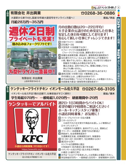 4はじめて掲載!お久しぶり掲載特集!●●●有限会社井出興業有限会社井出興業上田市芳田1943-5大屋駅から車で4分。国道18号線大屋信号をサンライン方面へ!担当/井出月の出勤日数は20∼22日平均!大手企業の元請けのため安定した仕事と安定した休日を可能にしております!安心して新しい仕事にチャレンジできます!月給28万円∼35万円☎0268-36-0886上田市大型ドライバー(長距離)正社員2∼3名大型免許※未経験でもOK!※フォークリフト技能講習修了(フォークリフトは入社後、講習も受けられます)各種社会保険完備、昇給あり、資格取得支援制度あり当社運行スケジュールによる(運行先により変動あり)※朝、積み下ろしを行い、積込みは、その場で行う場合や 移動先での積込みの場合があります。 積込み後は、自宅で休んでも、現場に移動してから 休んでも構いません。 取引先によって、当日帰宅できる運行もあります♪週休2日制※年間116日※勤務表による。月の9割以上は、土曜日もお休みです!まずはお気軽に「ココどう?を見ました」とお電話ください。未経験者大歓迎!資格取得支援制度あり!週休2日制プライベートも充実!大型ドライバー急募中!積み込みはフォークリフトです!ケンタッキーフライドチキンイオンモール佐久平店ケンタッキーフライドチキンイオンモール佐久平店佐久市佐久平駅南11-10https://www.kfc.co.jpイオンモール佐久平店1階の店舗で、仕事前後がすごく便利!担当/高木週2日・1日3時間からバイトOK!希望の曜日や時間をご相談ください!ホール・キッチンスタッフ募集!小諸店同時募集♪お気軽に!学生時給970円∼一般時給1,020円∼研修期間中-20円☎0267-66-3105佐久市パート・アルバイト4∼5名大募集①ホールスタッフ ※店内でのご注文受付や商品のお渡し、レジ業務など②キッチンスタッフ ※厨房内での調理や、食材の下ごしらえ、清掃などフリーター・未経験者・長期できる方歓迎♪昇給あり、社会保険制度あり交通費規定支給、従業員割引あり、制服貸与10:00∼22:00の間で、1日3時間からOK!週2日からOK!※シフトは2週間毎に提出※有給あり(社内規定に基づき支給)イオンモール佐久平店(佐久市佐久平駅南)小諸店(小諸市三和)まずは「ココどう?を見ました」とお気軽にお電話ください。学生時給970円∼一般時給1,020円∼研修期間中-20円小諸店も同時募集♪R18沿いです!ケンタッキーでアルバイト