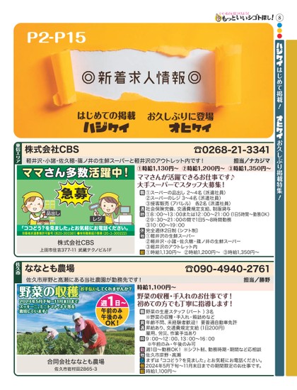 8はじめて掲載!お久しぶり掲載特集!●●●P2-P15お久しぶりに登場はじめての掲載野菜の生産スタッフ(パート)3名※野菜の収穫・手入れ・箱詰めなど年齢不問、未経験者歓迎!要普通自動車免許昇給あり、交通費規定支給(1日200円)雇用、労災、作業手当あり9:00∼12:00、13:00∼16:00※午前のみ・午後のみ可週1日∼勤務OK!※シフト制、勤務時期・期間など応相談佐久市岸野・高瀬まずは「ココどう?を見ました」とお気軽にお電話ください。2024年5月下旬∼11月末日までの期間限定のお仕事です。時給1,100円∼ななとも農場合同会社ななとも農場佐久市岩村田2865-3佐久市岸野と高瀬にある当社農園が勤務先です!担当/勝野野菜の収穫・手入れのお仕事です!初めての方でも丁寧に指導します!時給1,100円∼☎090-4940-2761佐久市野菜の収穫収穫お手伝いしてくれませんか?してくれませんか?週日∼1OK!午前のみ午後のみ2024年5月下旬∼11月末日までズッキーニ、ミニトマト、ネギ等を栽培しています!①スーパーの品出し2∼4名(派遣社員)②スーパーのレジ3∼4名(派遣社員)③接客販売(アパレル)各2名(派遣社員)社会保険完備、交通費規定支給、制服貸与①8:00∼13:00または12:00∼21:00(1日5時間∼勤務OK)②9:30∼21:00の間で1日5∼8時間勤務③10:00∼19:00完全週休2日制(シフト制)①軽井沢の生鮮スーパー②軽井沢・小諸・佐久穂・篠ノ井の生鮮スーパー③軽井沢のアウトレット内①時給1,130円∼②時給1,200円∼③時給1,350円∼株式会社CBS株式会社CBS上田市住吉377-11武蔵テクノビル1F軽井沢・小諸・佐久穂・篠ノ井の生鮮スーパーと軽井沢のアウトレット内です!担当/ナカジマママさんが活躍できるお仕事です♪大手スーパーでスタッフ大募集!①時給1,130円∼②時給1,200円∼③時給1,350円∼☎0268-21-3341東信エリア労働者派遣事業許可番号(派20-300381)●有料職業紹介事業(20-ユ-300222)急募「ココどう?を見ました」とお気軽にお電話ください。ママさん多数活躍中!さん多数活躍中!品出しレジ