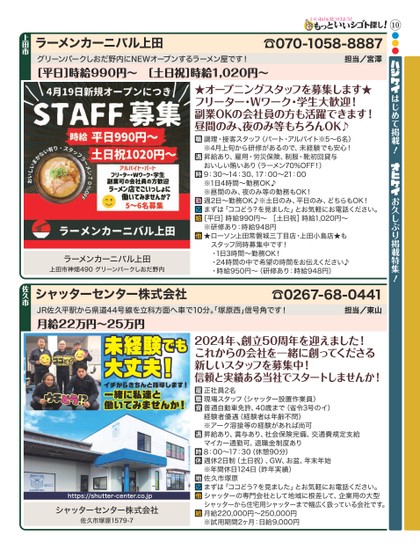 10はじめて掲載!お久しぶり掲載特集!●●●ラーメンカーニバル上田ラーメンカーニバル上田上田市神畑490グリーンパークしおだ野内グリーンパークしおだ野内にNEWオープンするラーメン屋です!担当/宮澤★オープニングスタッフを募集します★フリーター・Wワーク・学生大歓迎!副業OKの会社員の方も活躍できます!昼間のみ、夜のみ等もちろんOK♪[平日]時給990円∼[土日祝]時給1,020円∼☎070-1058-8887上田市調理・接客スタッフ(パート・アルバイト※5∼6名)※4月上旬から研修があるので、未経験でも安心!昇給あり、雇用・労災保険、制服・靴初回貸与おいしい賄いあり(ラーメン70%OFF!)9:30∼14:30、17:00∼21:00※1日4時間∼勤務OK♪※昼間のみ、夜のみ等の勤務もOK!週2日∼勤務OK♪※土日のみ、平日のみ、どちらもOK!まずは「ココどう?を見ました」とお気軽にお電話ください。[平日]時給990円∼[土日祝]時給1,020円∼※研修あり:時給948円★ローソン上田常磐城三丁目店・上田小島店★も スタッフ同時募集中です! ・1日3時間∼勤務OK! ・24時間の中で希望の時間をお伝えください♪ ・時給950円∼(研修あり:時給948円)シャッターセンター株式会社シャッターセンター株式会社佐久市塚原1579-7JR佐久平駅から県道44号線を立科方面へ車で10分。「塚原西」信号角です!担当/東山2024年、創立50周年を迎えました!これからの会社を一緒に創ってくださる新しいスタッフを募集中!信頼と実績ある当社でスタートしませんか!月給22万円∼25万円☎0267-68-0441佐久市正社員2名現場スタッフ(シャッター設置作業員)普通自動車免許、40歳まで(省令3号のイ)経験者優遇(経験者は年齢不問)※アーク溶接等の経験があれば尚可昇給あり、賞与あり、社会保険完備、交通費規定支給マイカー通勤可、退職金制度あり8:00∼17:30(休憩90分)週休2日制(土日祝)、GW、お盆、年末年始※年間休日124日(昨年実績)佐久市塚原まずは「ココどう?を見ました」とお気軽にお電話ください。シャッターの専門会社として地域に根差して、企業用の大型シャッターから住宅用シャッターまで幅広く扱っている会社です。月給220,000円∼250,000円※試用期間2ヶ月:日給9,000円https://shutter-center.co.jp未経験でも大丈夫!イチからきちんと指導します!一緒に私達と働いてみませんか!