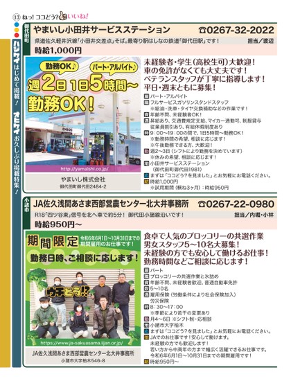 ねっ!ココどう?13はじめて掲載!お久しぶり掲載特集!●●●JA佐久浅間あさま西部営農センター北大井事務所JA佐久浅間あさま西部営農センター北大井事務所小諸市大字柏木546-8https://www.ja-sakuasama.iijan.or.jp/R18「四ツ谷東」信号を北へ車で約5分!御代田小諸線沿いです!担当/内堀・小林食卓で人気のブロッコリーの共選作業男女スタッフ5∼10名大募集!未経験の方でも安心して働けるお仕事!勤務時間などご相談に応じます!時給950円∼☎0267-22-0980小諸市パートブロッコリーの共選作業と氷詰め年齢不問、未経験者歓迎、普通自動車免許5∼10名雇用保険(労働条件により社会保険加入)労災保険8:30∼17:00※季節により若干の変更あり月4∼6日※シフト制・応相談小諸市大字柏木まずは「ココどう?を見ました」とお気軽にお電話ください。JAでのお仕事です!安心して働けます。未経験の方でも歓迎します!若い方から中高年の方まで幅広く活躍できるお仕事です。令和6年6月1日∼10月31日までの期間雇用です!時給950円∼勤務日時、ご相談に応じます!令和6年6月1日∼10月31日までの期間雇用のお仕事です!やまいし小田井サービスステーションやまいし株式会社御代田町御代田2484-2http://yamaishi.co.jp/県道佐久軽井沢線「小田井交差点」そば。最寄り駅はしなの鉄道「御代田駅」です!担当/渡辺未経験者・学生(高校生可)大歓迎!車の免許がなくても大丈夫です!ベテランスタッフが丁寧に指導します!平日・週末ともに募集!時給1,000円☎0267-32-2022御代田町パート・アルバイトフルサービスガソリンスタンドスタッフ※給油・洗車・タイヤ交換補助などの作業です!年齢不問、未経験者OK!昇給あり、交通費規定支給、マイカー通勤可、制服貸与従業員割引あり、有給休暇制度あり9:00∼19:00の間で、1日5時間∼勤務OK!※勤務時間の希望、相談に応じます!※午後勤務できる方、大歓迎!週2∼3日(シフトにより勤務を決めています)※休みの希望、相談に応じます!小田井サービスステーション(御代田町御代田1981)まずは「ココどう?を見ました」とお気軽にお電話ください。時給1,000円※試用期間(概ね3ヶ月):時給950円勤務OK♪パート・アルバイト♪週勤務OK!日1日時間∼25