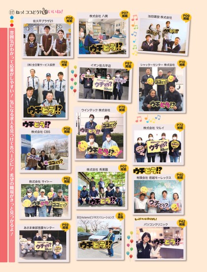 ねっ!ココどう?17雰囲気がわかって応募がしやすい!気になる求人を見つけて各ページに!希望の職場がきっと見つかるよ!●●●あさま東部営農センターP59掲載日立Astemoビジネスソリューションズ表2掲載池田建設株式会社P09掲載株式会社八興P07掲載佐久平プラザ21P06掲載シャッターセンター株式会社P10掲載(株)全日警サービス長野P58掲載株式会社マルイP72掲載イオン佐久平店P87掲載株式会社CBSP08掲載有限会社信越モーレックスP40掲載株式会社秀果園P07掲載株式会社サイトーP62掲載パソコンクリニックP42掲載ウインテック株式会社P75掲載