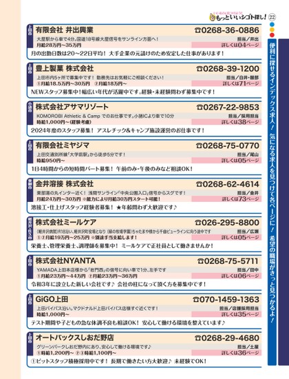 22便利に探せるインデックス求人!気になる求人を見つけて各ページに!希望の職場がきっと見つかるよ!●●●有限会社井出興業大屋駅から車で4分。国道18号線大屋信号をサンライン方面へ!担当/井出月の出勤日数は20∼22日平均!大手企業の元請けのため安定した仕事があります!月給28万円∼35万円☎0268-36-0886上田市詳しくは04ページ豊上製菓株式会社上田市内5ヶ所で募集中です!勤務先はお気軽にご相談ください!担当/白井・服部NEWスタッフ募集中!幅広い年代が活躍中です。経験・未経験問わず募集中です!①月給18.5万円∼30万円②月給18万円∼☎0268-39-1200上田市詳しくは71ページ株式会社アサマリゾートKOMOROBIAthletic&Campでのお仕事です。小諸ICより車で10分担当/採用担当2024年度のスタッフ募集!アスレチック&キャンプ施設運営のお仕事です!時給1,000円∼(経験考慮)☎0267-22-9853小諸市詳しくは38ページ有限会社ミヤジマ上田交通別所線「大学前駅」から徒歩5分です!担当/尾山1日4時間からの短時間パート募集!午前のみ・午後のみなど相談OK!時給950円∼☎0268-75-0770上田市詳しくは05ページ金井溶接株式会社東部湯の丸インター近く!浅間サンライン「中央公園入口」信号からスグです!担当/金井溶接工・仕上げスタッフ経験者募集!★年齢問わず大歓迎です♪月給24万円∼30万円※能力により月給30万円スタート可能!☎0268-62-4614東御市詳しくは73ページ株式会社ミールケア(軽井沢病院)R18沿い、軽井沢町役場となり(緑の牧場学園)ちゃたまや様から千曲ビューラインに向う途中です担当/広瀬栄養士、管理栄養士、調理師を募集中!ミールケアで正社員として働きませんか!①②月給19万円∼25万円※別途手当支給します!☎026-295-8800軽井沢・佐久市詳しくは05ページ株式会社NYANTAYAMADA上田本店様から「岩門西」の信号に向い車で1分、左手です担当/田中令和3年に設立した新しい会社です♪会社の柱になって頂く方を募集中です!①月給23万円∼44万円②月給23万円∼36万円☎0268-75-5711上田市詳しくは06ページGiGO上田上田バイパス沿い。マクドナルド上田バイパス店様すぐ近くです!担当/店舗採用担当テスト期間や子どもの急な体調不良も相談OK!安心して働ける環境を整えています♪時給1,000円∼☎070-1459-1363上田市詳しくは35ページオートバックスしおだ野店グリーンパークしおだ野内にあり、安心して働ける環境です♪担当/土屋①ピットスタッフ積極採用中です!長期で働きたい方大歓迎♪未経験でOK!①時給1,200円∼②③時給1,100円∼☎0268-29-4680上田市詳しくは36ページ
