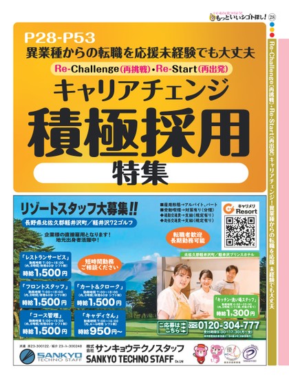 28●●●キャリアチェンジ!異業種からの転職を応援未経験でも大丈夫Re-Challenge(再挑戦)・Re-Start(再出発)P28-P53特集異業種からの転職を応援未経験でも大丈夫Re-Challenge(再挑戦)・Re-Start(再出発)キャリアチェンジ積極採用派遣派23-300122/紹介23-ユ-3002480120-304-777受付時間9:00∼17:30(月∼金)ご応募はこちら企業様の直接雇用となります!地元出身者活躍中!リゾートスタッフ大募集!!長野県北佐久郡軽井沢町/軽井沢72ゴルフ北佐久郡軽井沢町/軽井沢プリンスホテル時給1,500円「フロントスタッフ」勤務時間7:00∼18:00(内、8時間/休憩60分シフト制)時給1,500円「レストランサービス」勤務時間7:00∼18:00(内、8時間/休憩60分シフト制)時給1,300円「キッチン・洗い場スタッフ」勤務時間6:00∼25:00(内、8時間/シフト制、中抜け有り)時給1,500円「コース管理」勤務時間5:00∼15:00(内、8時間/休憩60分シフト制)時給1,500円「カート&クローク」勤務時間7:00∼18:00(内、8時間/休憩60分シフト制)時給950円∼「キャディさん」勤務時間7:00∼16:00(内、4∼6時間シフト制)■雇用形態→アルバイト、パート■受動喫煙→対策有り(分煙)◆通勤交通費→支給(規定有り) ◆赴任交通費→支給(規定有り)短時間勤務ご相談ください転職者歓迎長期勤務可能東京都豊島区東池袋3丁目4番3号【池袋営業所】