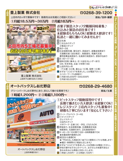 36●●●キャリアチェンジ!異業種からの転職を応援未経験でも大丈夫Re-Challenge(再挑戦)・Re-Start(再出発)豊上製菓株式会社豊上製菓株式会社上田市下之郷1525-1(本社)上田市内5ヶ所で募集中です!勤務先はお気軽にご相談ください!担当/白井・服部お菓子製造スタッフ2職種同時募集♪仕込みと製造のお仕事です!未経験者もちろんOK!経験者大歓迎です!私達と一緒に働いてみませんか!①月給18.5万円∼30万円②月給18万円∼☎0268-39-1200上田市正社員①仕込みスタッフ②製造スタッフ各2∼3名社会保険完備、賞与あり、昇給あり、退職金制度あり交通費支給(当社規定)、制服貸与、残業代支給慶弔見舞金制度あり、社員旅行制度あり、家族手当あり8:00∼17:00週休2日制(基本土・日※会社カレンダーあり)GW、年末年始、お盆※年間114日上田市内5ヶ所(下之郷:3工場、富士山:1工場、保野:1工場)まずは「ココどう?を見ました」とお電話下さい♪※ハローワークも登録中!①月給185,000円∼300,000円②月給180,000円∼http://www.hojo-seika.jp/上田市内5工場で募集中!お近くの工場で働けます!オートバックスしおだ野店オートバックスしおだ野店上田市神畑518-1https://recruit.wadasho.co.jp/グリーンパークしおだ野内にあり、安心して働ける環境です♪担当/土屋①ピットスタッフ積極採用中です! 長期で働きたい方大歓迎♪未経験でOK!②レジスタッフ③店内スタッフも募集中! 研修も丁寧に行います!安心して下さい♪①時給1,200円∼②③時給1,100円∼☎0268-29-4680上田市パート・アルバイト3∼4名①ピットスタッフ②レジスタッフ③店内スタッフ※Wワーク・主婦(夫)・学生、どなたもOK昇給あり、社会保険完備、交通費規定支給制服貸与、社員割引あり、正社員登用あり9:45∼19:10の間で1日6∼8時間勤務でOK★扶養控除内勤務もOK週3日から勤務OK★「平日のみ」も相談OK!★テスト期間のシフトも考慮します!★曜日・時間帯のご相談に応じます♪まずは「ココどう?を見ました」とお気軽にお電話ください。学校行事やお子さんのイベント、お子さんの体調不良など急なお休みにも柔軟に対応いたします。①時給1,200円∼②③時給1,100円∼★週3日から勤務OK!★「平日のみ」も相談OK!★10:00∼16:00もOK!1,200円∼時給ピットスタッフ