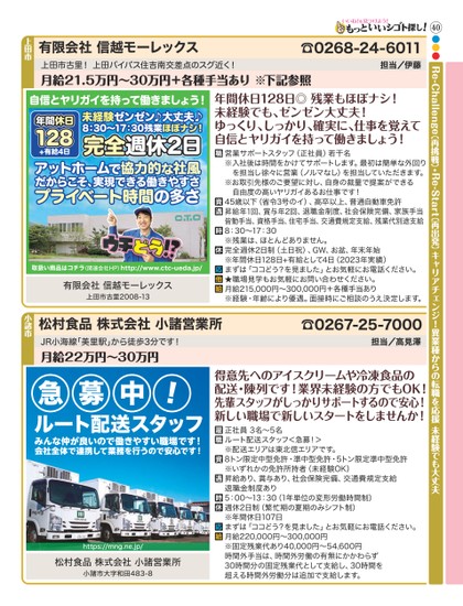 40●●●キャリアチェンジ!異業種からの転職を応援未経験でも大丈夫Re-Challenge(再挑戦)・Re-Start(再出発)有限会社信越モーレックス有限会社信越モーレックス上田市古里2008-13上田市古里!上田バイパス住吉南交差点のスグ近く!担当/伊藤年間休日128日◎残業もほぼナシ!未経験でも、ゼンゼン大丈夫!ゆっくり、しっかり、確実に、仕事を覚えて自信とヤリガイを持って働きましょう!月給21.5万円∼30万円+各種手当あり※下記参照☎0268-24-6011上田市営業サポートスタッフ(正社員)若干名※入社後は時間をかけてサポートします。最初は簡単な外回り を担当し徐々に営業(ノルマなし)を担当していただきます。※お取引先様のご要望に対し、自身の裁量で提案ができる 自由度の高いヤリガイあるお仕事です!45歳以下(省令3号のイ)、高卒以上、普通自動車免許昇給年1回、賞与年2回、退職金制度、社会保険完備、家族手当皆勤手当、資格手当、住宅手当、交通費規定支給、残業代別途支給8:30∼17:30※残業は、ほとんどありません。完全週休2日制(土日祝)、GW、お盆、年末年始※年間休日128日+有給として4日(2023年実績)まずは「ココどう?を見ました」とお気軽にお電話ください。★職場見学もお気軽にお問い合わせください。月給215,000円∼300,000円+各種手当あり※経験・年齢により優遇。面接時にご相談のうえ決定します。松村食品株式会社小諸営業所松村食品株式会社小諸営業所小諸市大字和田483-8https://mng.ne.jp/JR小海線「美里駅」から徒歩3分です!担当/高見澤得意先へのアイスクリームや冷凍食品の配送・陳列です!業界未経験の方でもOK!先輩スタッフがしっかりサポートするので安心!新しい職場で新しいスタートをしませんか!月給22万円∼30万円☎0267-25-7000小諸市正社員3名∼5名ルート配送スタッフ<急募!>※配送エリアは東北信エリアです。8トン限定中型免許・準中型免許・5トン限定準中型免許※いずれかの免許所持者(未経験OK)昇給あり、賞与あり、社会保険完備、交通費規定支給退職金制度あり5:00∼13:30(1年単位の変形労働時間制)週休2日制(繁忙期の夏期のみシフト制)※年間休日107日まずは「ココどう?を見ました」とお気軽にお電話ください。月給220,000円∼300,000円※固定残業代あり40,000円∼54,600円時間外手当は、時間外労働の有無にかかわらず30時間分の固定残業代として支給し、30時間を超える時間外労働分は追加で支給します。ルート配送スタッフみんな仲が良いので働きやすい職場です!会社全体で連携して業務を行うので安心です!急募中!(関連会社HP)http://www.ctc-ueda.jp/年間休日128休日完全週休2日未経験ゼンゼン♪大丈夫♪8:30∼17:30残業ほぼナシ!ゼンゼン♪大丈夫♪ほぼナシ!取扱い商品はコチラアットホームで協力的な社風だからこそ、実現できる働きやすさプライベート時間の多さ+有給4日自信とヤリガイを持って働きましょう!