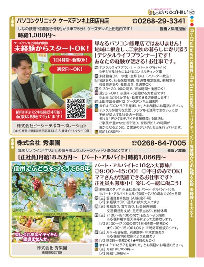 42●●●キャリアチェンジ!異業種からの転職を応援未経験でも大丈夫Re-Challenge(再挑戦)・Re-Start(再出発)パソコンクリニックケーズデンキ上田店内店株式会社ピーシーデポコーポレーション[本社]神奈川県横浜市西区高島1-2-5横濱ゲートタワー19階しなの鉄道「信濃国分寺駅」から車で5分!ケーズデンキ上田店内です!担当/採用担当単なるパソコン修理店ではありません!地域に根差し、ご家族の暮らしに寄り添う「デジタルライフプランナー」です!あなたの経験が活きる!お仕事です。時給1,080円∼☎0268-29-3341上田市デジタルライフプランナー(パート・アルバイト)※デジタル社会におけるコンサルティング業未経験者OK!学生・主婦(夫)・フリーター歓迎!昇給あり、社会保険完備、交通費規定支給、制服貸与社員登用あり、社割あり、車通勤OK9:30∼20:00の間で、1日4時間∼勤務OK!週2日∼OK!※週4∼5日働ける方歓迎です!※土日(どちらかでも)勤務できる方優遇します!上田市国分80-12ケーズデンキ上田店内まずは「ココどう?を見ました」とお気軽にお電話ください。デジタルが便利な反面、デジタルを活用できない人には不便が拡大する社会の一側面。それら「デジタルデバイド情報格差」を解決しご家族が豊かな生活を送り、家族団らんの時間が豊かになるように、ご家族のデジタル担当を行っています。時給1,080円∼未経験からスタートOK!ケーズデンキ上田店内勤務1日4時間∼勤務OK!週2日∼OK!採用HPより24時間受付可能!面接は現地で行います!株式会社秀果園株式会社秀果園東御市和2789https://syuka-en.com/浅間サンライン「下大川」の信号を上りガレージハットリ様の近くです!担当/渡邉パート・アルバイト<10名>大募集!◎9:00∼15:00!◎平日のみでOK!ママさんが活躍できるお仕事です♪正社員も募集中!楽しく一緒に働こう![正社員]月給18.5万円∼[パート・アルバイト]時給1,066円∼☎0268-64-7005東御市果樹園スタッフ※正社員1名パート・アルバイト10名※パート・アルバイトは5/20頃∼7/20頃までの2ヶ月間[正]普通自動車免許(AT限定不可)[パ]未経験でOK!通えれば大丈夫です♪[正]昇給あり、賞与あり、社会保険完備 交通費規定支給、住宅手当あり、有給休暇[正]7:00∼18:00の間で1日5.5∼9.5時間 ※収穫時期や悪天候等によって変動致します。[パ]8:00∼17:00の間で1日4時間∼勤務OK ★9:00∼15:00もOK♪※時間帯相談OKです。[正]月4∼8日程度、別途夏季・年末休暇あり ※収穫期や閑散期により変動あり[パ]週2日∼勤務OK!★平日のみOK!まずは「ココどう?を見ました」とお気軽にお電話ください。[正]月給185,000円∼[パ]時給1,066円∼信州でぶどうをつくって68年楽しく元気にイキイキと働きませんか。