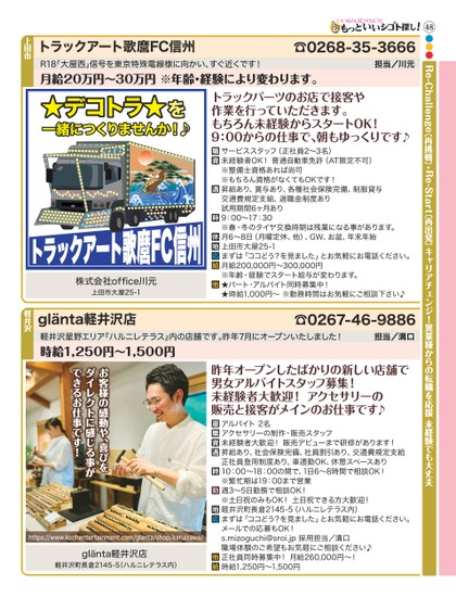 48●●●キャリアチェンジ!異業種からの転職を応援未経験でも大丈夫Re-Challenge(再挑戦)・Re-Start(再出発)トラックアート歌麿FC信州株式会社office川元上田市大屋25-1R18「大屋西」信号を東京特殊電線様に向かい、すぐ近くです!担当/川元トラックパーツのお店で接客や作業を行っていただきます。もちろん未経験からスタートOK!9:00からの仕事で、朝もゆっくりです♪月給20万円∼30万円※年齢・経験により変わります。☎0268-35-3666上田市サービススタッフ(正社員2∼3名)未経験者OK!普通自動車免許(AT限定不可)※整備士資格あれば尚可※もちろん資格がなくてもOKです!昇給あり、賞与あり、各種社会保険完備、制服貸与交通費規定支給、退職金制度あり試用期間6ヶ月あり9:00∼17:30※春・冬のタイヤ交換時期は残業になる事があります。月6∼8日(月曜定休、他)、GW、お盆、年末年始上田市大屋25-1まずは「ココどう?を見ました」とお気軽にお電話ください。月給200,000円∼300,000円※年齢・経験でスタート給与が変わります。★パート・アルバイト同時募集中!★時給1,000円∼※勤務時間はお気軽にご相談下さい♪★デコトラ★一緒につくりませんか!♪♪をglänta軽井沢店glänta軽井沢店軽井沢町長倉2145-5(ハルニレテラス内)https://www.kochentertainment.com/glanta/shop/karuizawa/軽井沢星野エリア『ハルニレテラス』内の店舗です。昨年7月にオープンいたしました!担当/溝口昨年オープンしたばかりの新しい店舗で男女アルバイトスタッフ募集!未経験者大歓迎!アクセサリーの販売と接客がメインのお仕事です♪時給1,250円∼1,500円☎0267-46-9886軽井沢アルバイト2名アクセサリーの制作・販売スタッフ未経験者大歓迎!販売デビューまで研修があります!昇給あり、社会保険完備、社員割引あり、交通費規定支給正社員登用制度あり、車通勤OK、休憩スペースあり10:00∼18:00の間で、1日6∼8時間で相談OK!※繁忙期は19:00まで営業週3∼5日勤務で相談OK!※土日祝のみもOK!土日祝できる方大歓迎!軽井沢町長倉2145-5(ハルニレテラス内)まずは「ココどう?を見ました」とお気軽にお電話ください。メールでの応募もOK!s.mizoguchi@sroi.jp採用担当/溝口職場体験のご希望もお気軽にご相談ください♪正社員同時募集中!月給260,000円∼!時給1,250円∼1,500円お客様の感動や、喜びをダイレクトに感じる事ができるお仕事です!
