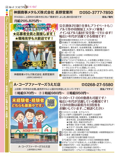 ねっ!ココどう?転職するなら多いほうがいい。oror49●●●キャリアチェンジ!異業種からの転職を応援未経験でも大丈夫Re-Challenge(再挑戦)・Re-Start(再出発)神鋼商事メタルズ株式会社長野営業所神鋼商事メタルズ株式会社長野営業所上田市仁古田482-2https://shinshometals.co.jp/R143沿い、上田市から青木村に向い「蕎麦切りよし吉」様の目の前です担当/堀内完全週休2日制!仕事もプライベートも◎アルミ等の切削加工スタッフ募集!メインはアルミ素材!安全第一で行います!幅広い年代が活躍できる環境です!月給205,825円∼☎050-3777-7850上田市非鉄金属の切削加工スタッフ[正社員1名]59歳以下(60歳定年のため)、普通自動車免許※フォークリフト免許は取得支援致します♪昇給あり、賞与あり、社会保険完備、交通費規定支給退職金制度あり、家族手当、制服貸与、資格取得支援あり8:45∼17:15完全週休2日制(土日祝)※年間休日125日上田市仁古田482-2まずは「ココどう?を見ました」とお気軽にお電話ください。神戸製鋼グループの当社は、アルミ板のフライス加工や精密切断を行い、お客様の前工程の省略・加工時間の短縮など、トータルコストダウンに貢献しています。お客様と綿密な打合せを行い、希望に沿った加工を行います。数量の大小に関わらず仕事を行っています。月給205,825円∼※固定残業代含む(固定残業代10時間分を支給し超える場合は追加で別途支給)神戸製鋼グループDesignsforBusiness★応募者全員と面接します!★職場見学も大歓迎です!A・コープファーマーズうえだ店A・コープファーマーズうえだ店上田市国分上沖80上田第一中学校の北側。直売所マルシェ国分を併設したスーパーです!担当/マチイ9:00∼17:00の勤務も可能です♪幅広い年代が活躍している職場です!土日の出勤は最低月4日程度をお願いしています。ご相談ください①時給970円∼②③時給980円∼④時給950円∼☎0268-27-5580上田市①②③パート社員④アルバイト①レジ部門②畜産部門③水産部門④全部門【パ】各種保険完備、制服貸与、交通費規定支給 賞与年2回、正社員登用制度あり ★日曜・祝日、時給100円UP! ★早朝8:00までの間、1時間以上勤務で時給200円UP! ★夕方17:00以降、時給150円UP!【ア】制服貸与、交通費規定支給【パ】8:00∼20:00の間で1日7時間勤務※時間帯相談OK!【パ】基本:週5日勤務で応相談 ※土日祝できる限り勤務できる方【ア】週3日∼OK!(相談OK)※1日3.5時間程度の勤務まずは「ココどう?を見ました」とお気軽にお電話ください。①時給970円∼※日・祝は時給1,070円∼②③時給980円∼※日・祝は時給1,080円∼④時給950円∼(アルバイトの時給は全て同じです)未経験者・経験者どちらも募集中です♪